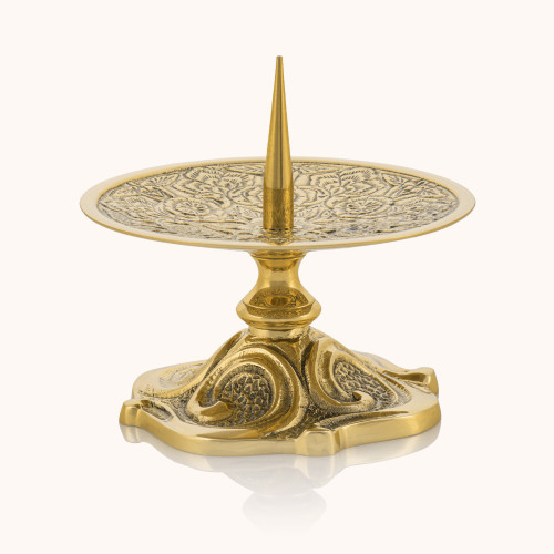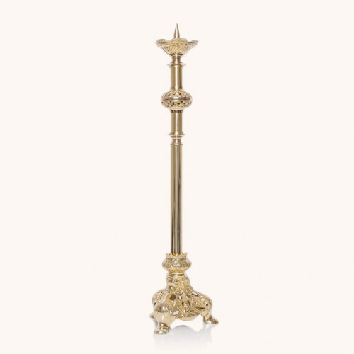 Lichtarz wykonany z odlewu mosiężnego, o wysokości 20 cm (bez szpica). Szerokość podstawy 18,5 cm i średnica miejsca pod świecę 13 cm zapewniają stabilność i wygodne osadzenie świecy ołtarzowej. Podstawa lichtarza ma trójnożną formę z dekoracyjnym motywem roślinnym, a miseczka na świecę zdobiona jest tłoczonym ornamentem w kształcie liści. Całość utrzymana w klasycznym stylu liturgicznym, z wysokim połyskiem i precyzyjnym wykończeniem.