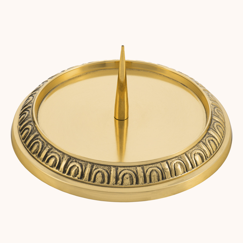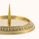 Lichtarz wykonany z odlewu mosiężnego, przeznaczony do użytku liturgicznego. Wysokość bez szpica wynosi 2 cm, dzięki czemu stanowi stabilną i dyskretną podstawę pod świecę ołtarzową. Średnica miejsca pod świecę to 9 cm, a szerokość podstawy 12 cm, co zapewnia pewne osadzenie i bezpieczeństwo podczas palenia świecy. Krawędź lichtarza zdobi delikatny relief w formie łukowych zdobień, nadający mu klasyczny charakter. Gładka, polerowana powierzchnia w połączeniu z subtelnym wzorem tworzy elegancki element wyposażenia ołtarza.