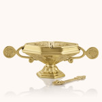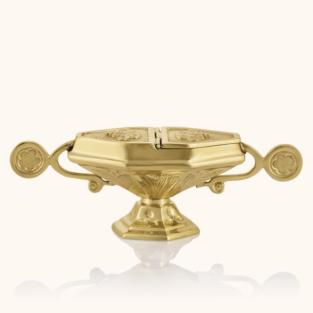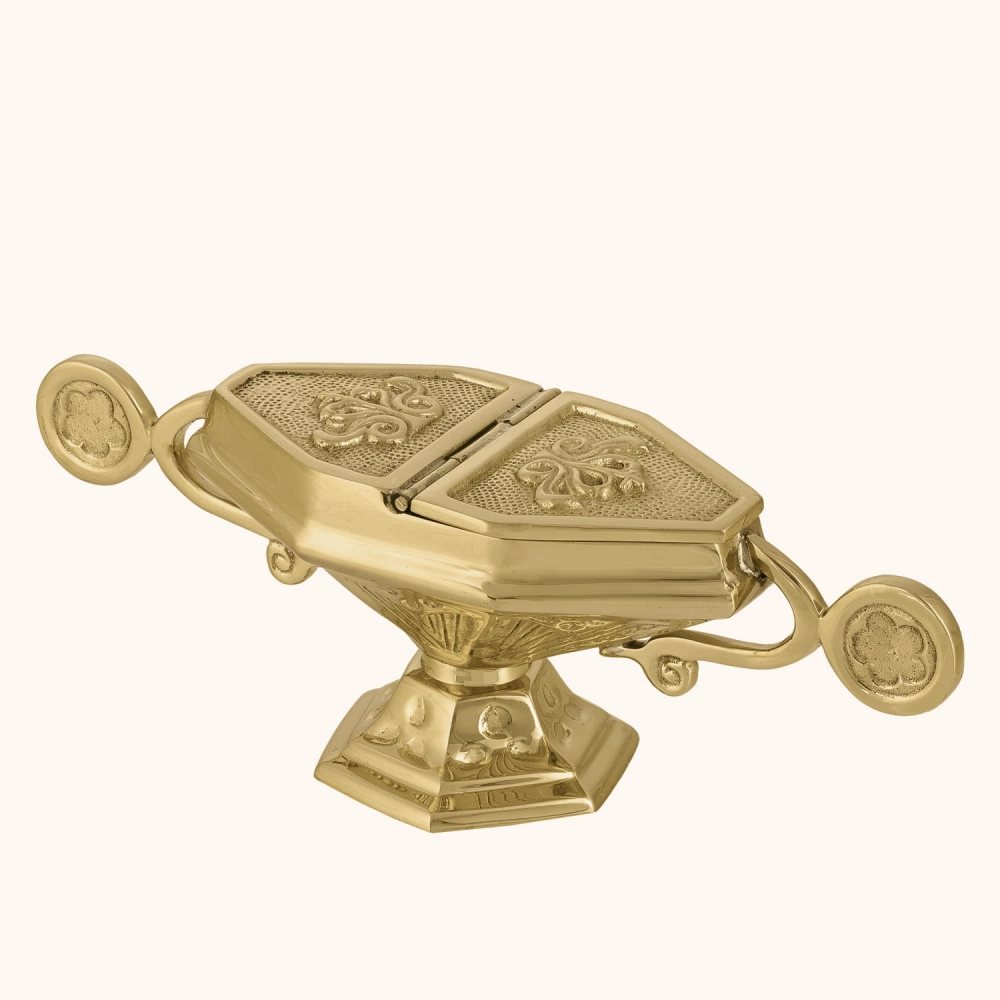 Łódka na kadzidło wykonana z mosiądzu, o wysokości 9 cm. Klasyczny model z pokrywką i łyżeczką w zestawie. Stabilna i solidna, przeznaczona do użytku liturgicznego w kościele lub kaplicy.