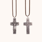 Metalowy krzyż inspirowany krzyżem papieża Franciszka, przedstawiający Chrystusa Dobrego Pasterza. Na rewersie modlitwa do Ducha Świętego i napis „Pamiątka Bierzmowania”. Zawieszony na sznurku o długości ok. 100 cm.