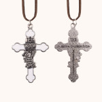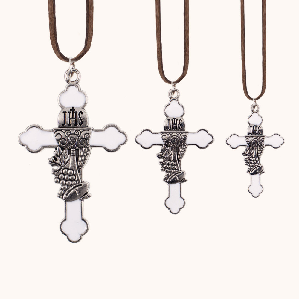 Metalowy krzyżyk z symbolem Eucharystii i napisem IHS, zawieszony na brązowym rzemyku. Na odwrocie wygrawerowane słowa „Ja jestem chlebem życia” oraz „Pamiątka Komunii Świętej”. Klasyczna i trwała pamiątka dla dziecka pierwszokomunijnego.