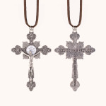 Metalowy krzyżyk z wizerunkiem Chrystusa i symbolem Eucharystii, zawieszony na brązowym rzemyku. Na rewersie napis „Jezu, do mnie przyjdź” oraz „Pamiątka Komunii Świętej”. Prosty i trwały symbol wiary, idealny na prezent komunijny.