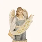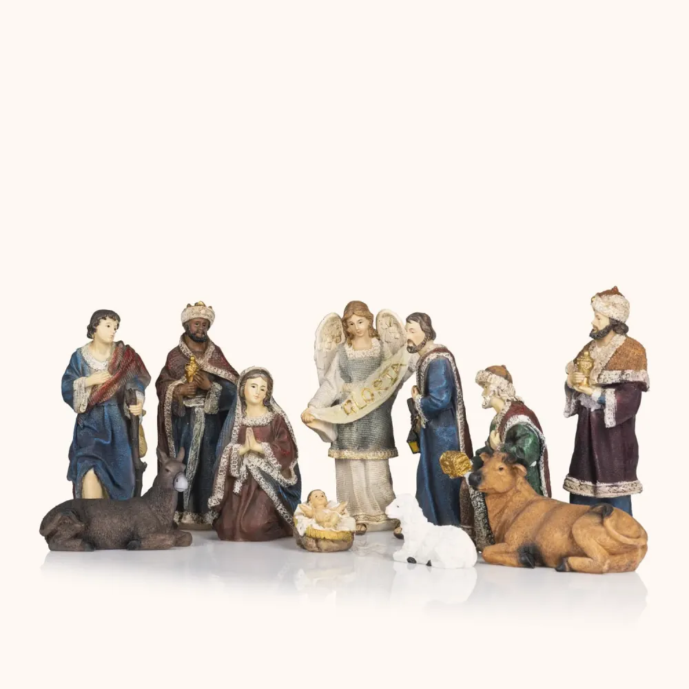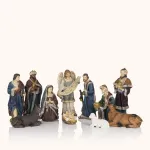 Komplet figur o wysokości 18 cm, ukazujący Świętą Rodzinę, Trzech Króli, anioła oraz zwierzęta. Delikatne kolory, srebrne i złote zdobienia nadają całości elegancki, świąteczny charakter. Idealna do domowych szopek i niewielkich przestrzeni dekoracyjnych.