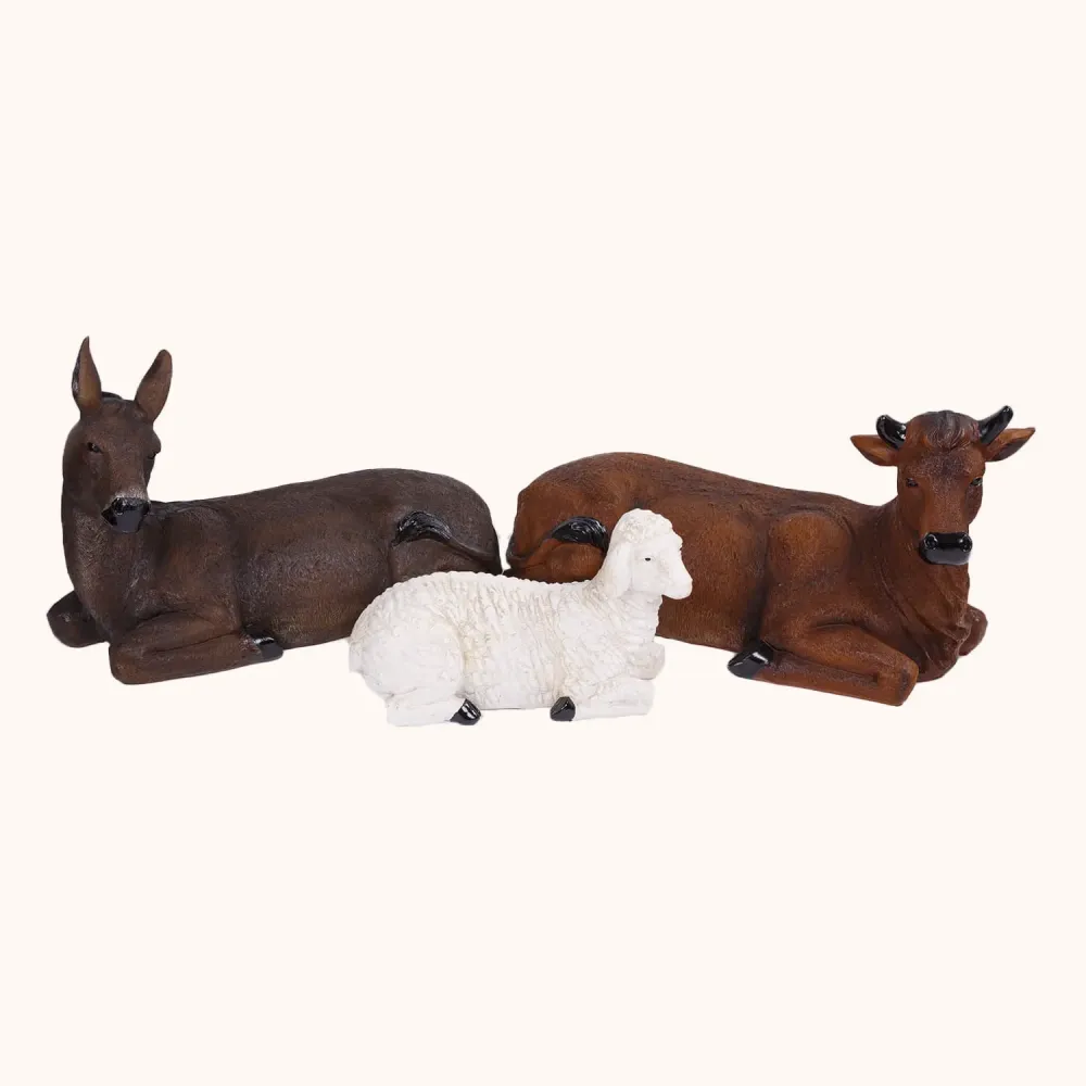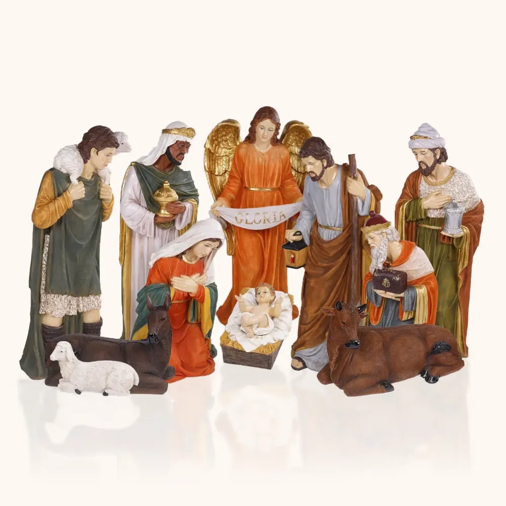 Żywe kolory, złote akcenty i starannie odwzorowane detale nadają całości wyjątkową głębię i blask. Zestaw wykonany z trwałej żywicy, idealny do dużych wnętrz, kościołów i przestrzeni wystawowych.