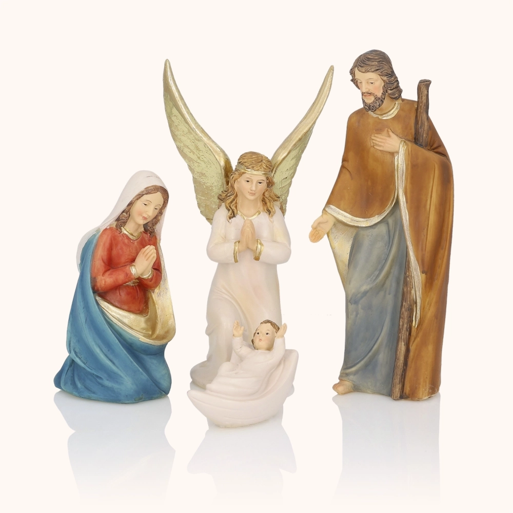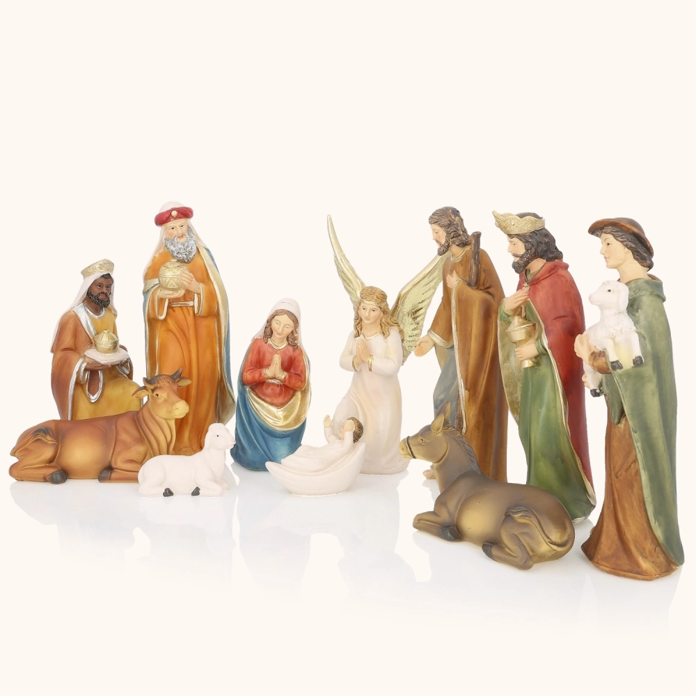 Szopka bożonarodzeniowa o wysokości 20 cm. Zestaw przedstawia Świętą Rodzinę, Trzech Króli, pasterza, anioła i zwierzęta. Utrzymana w ciepłych barwach, wykonana z dbałością o szczegóły. Klasyczna dekoracja świąteczna do domu lub kaplicy.