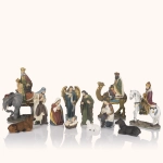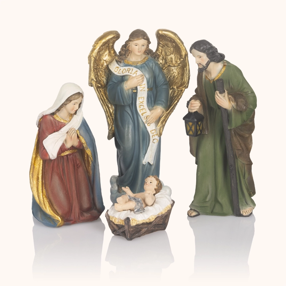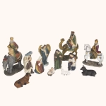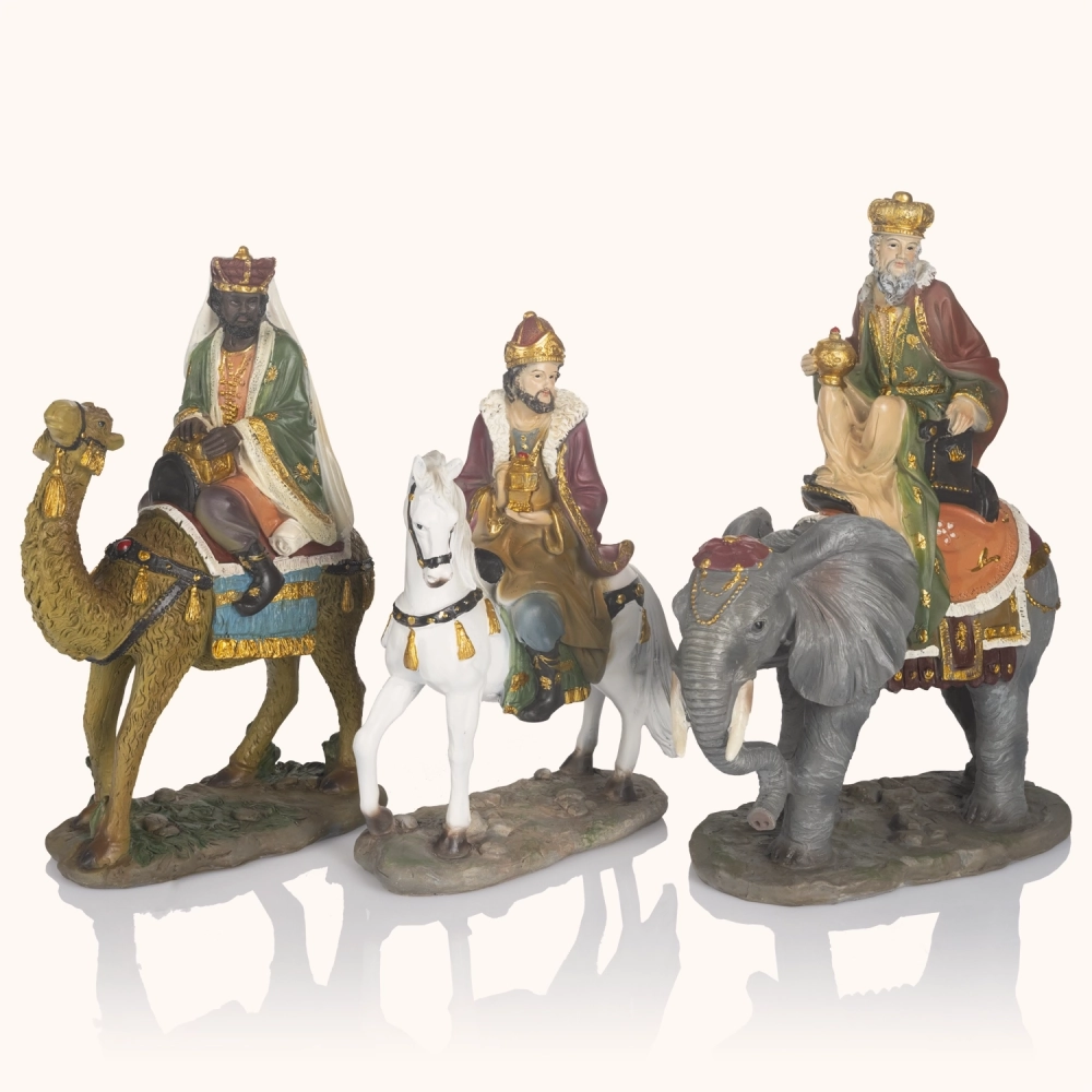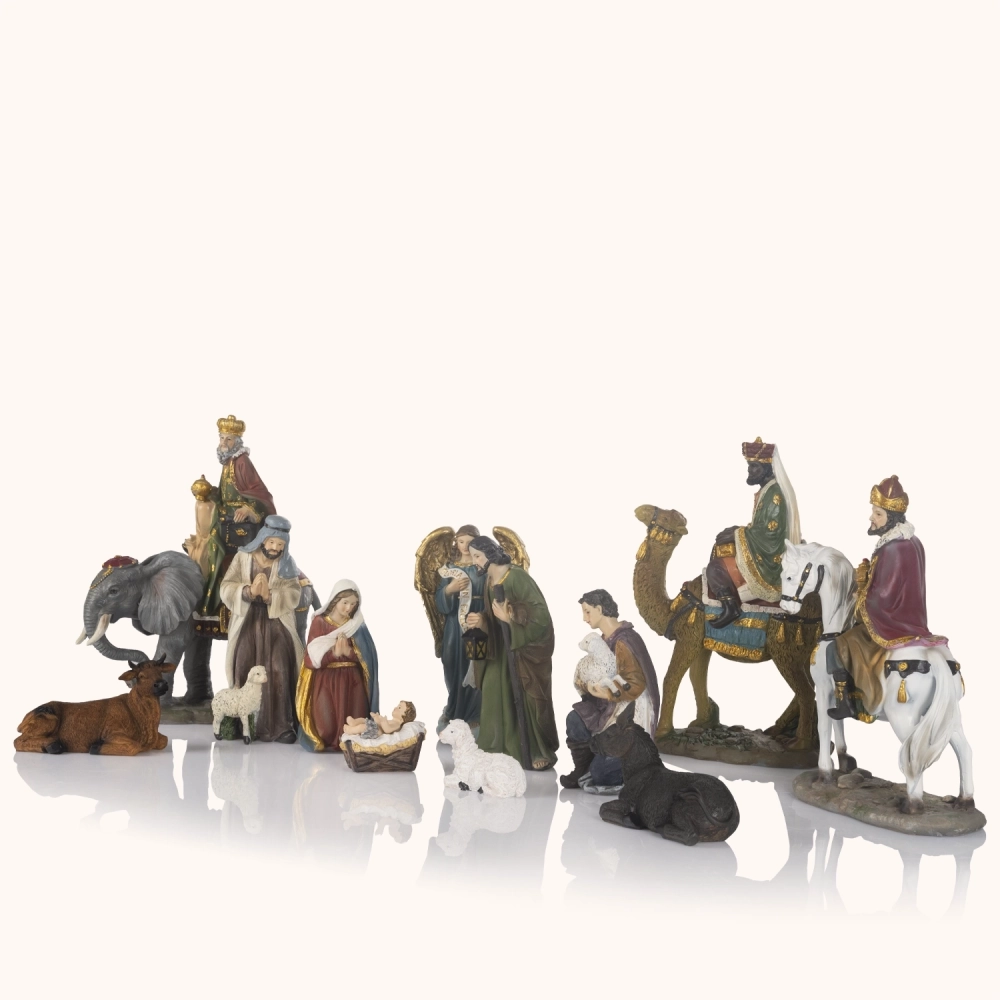 Szopka bożonarodzeniowa o wysokości 30 cm. Zestaw obejmuje Świętą Rodzinę, Trzech Króli na zwierzętach, pasterzy, anioła i zwierzęta. Bogato zdobiona, w klasycznej kolorystyce. Doskonała jako okazała dekoracja świąteczna w domu lub kościele.