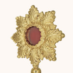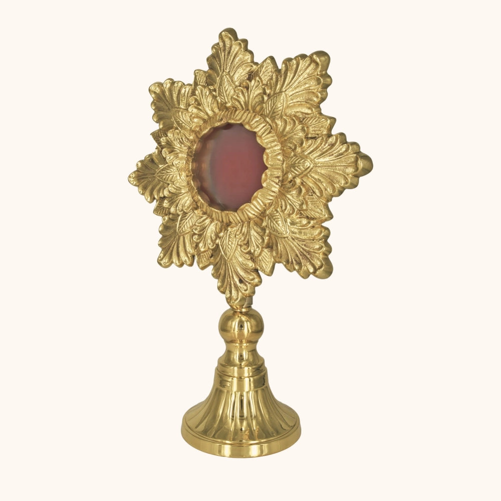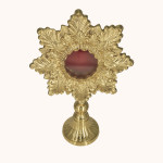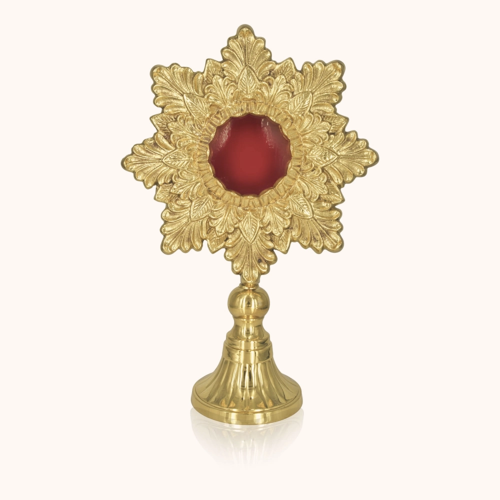 Relikwiarz wykonany z mosiądzu o wysokości 30 cm. Posiada formę promienistej gwiazdy symbolizującej światło wiary. Starannie zdobiony, osadzony na stabilnej podstawie - doskonały do eksponowania relikwii w prezbiterium, kaplicy lub zakrystii.
