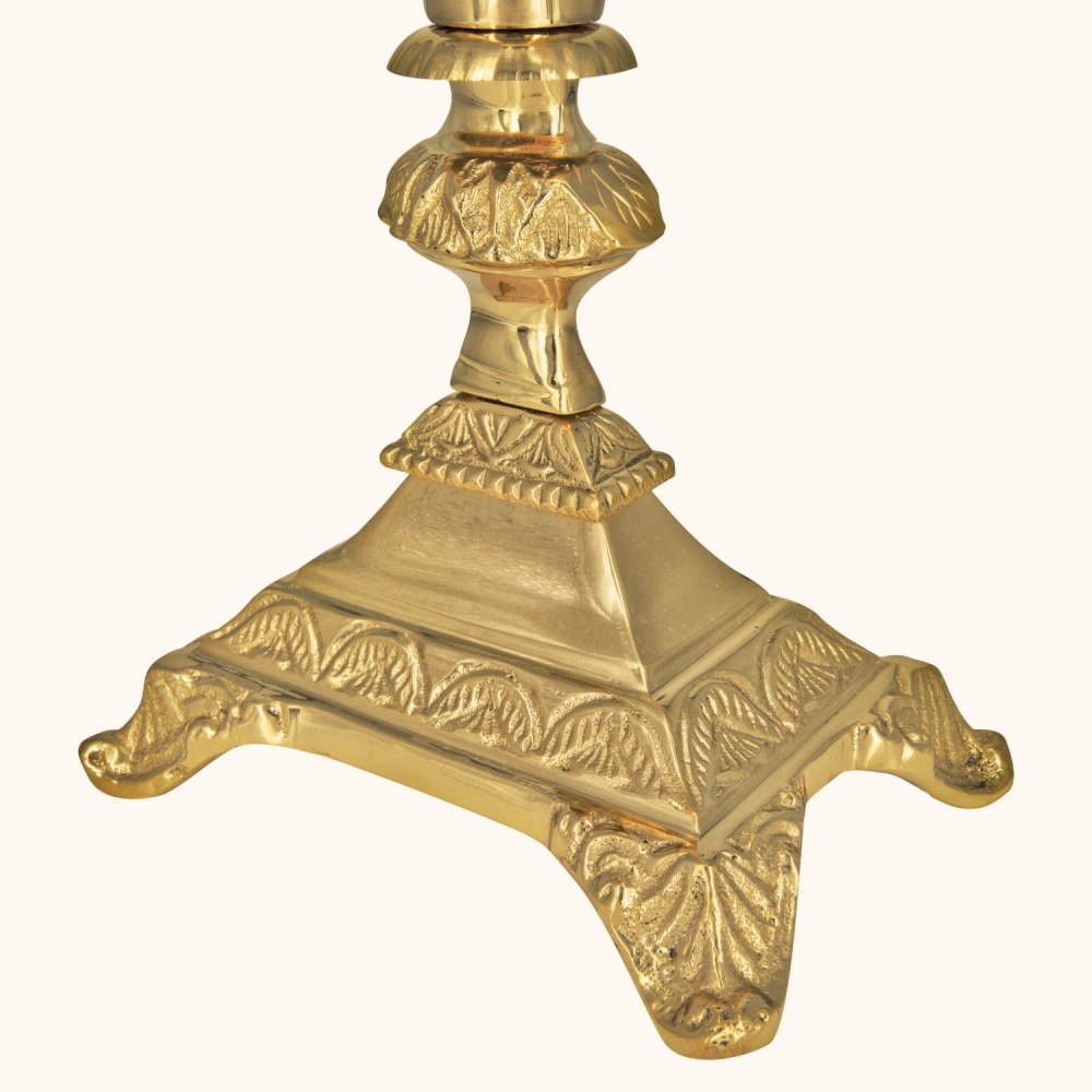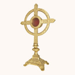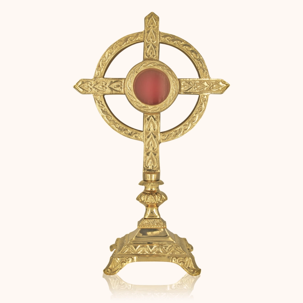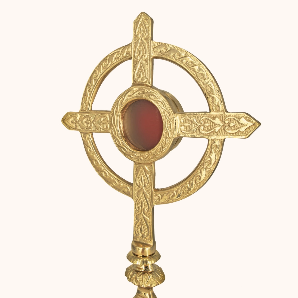 Relikwiarz wykonany z mosiądzu o wysokości 34 cm. Bogato zdobiony, w formie krzyża celtyckiego z centralnym miejscem na relikwie. Stabilna podstawa zapewnia pewne ustawienie. Trwały, efektowny i starannie wykonany - przeznaczony do kościołów i kaplic.