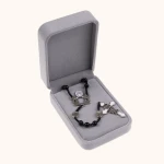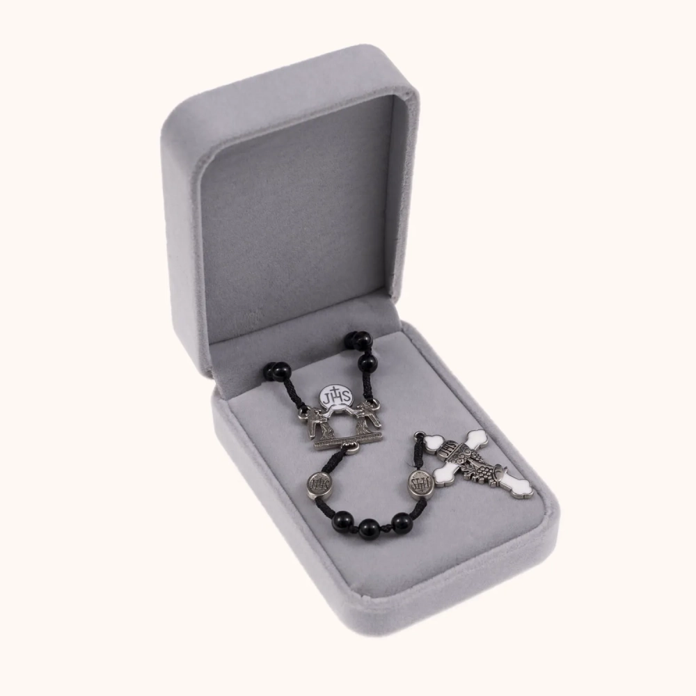 Różaniec z naturalnego agatu o średnicy 6 mm, na czarnym sznurku. Zdobiony metalowym krzyżykiem i łącznikiem z motywem Eucharystycznym. Trwały, elegancki, idealny na pamiątkę Pierwszej Komunii Świętej.