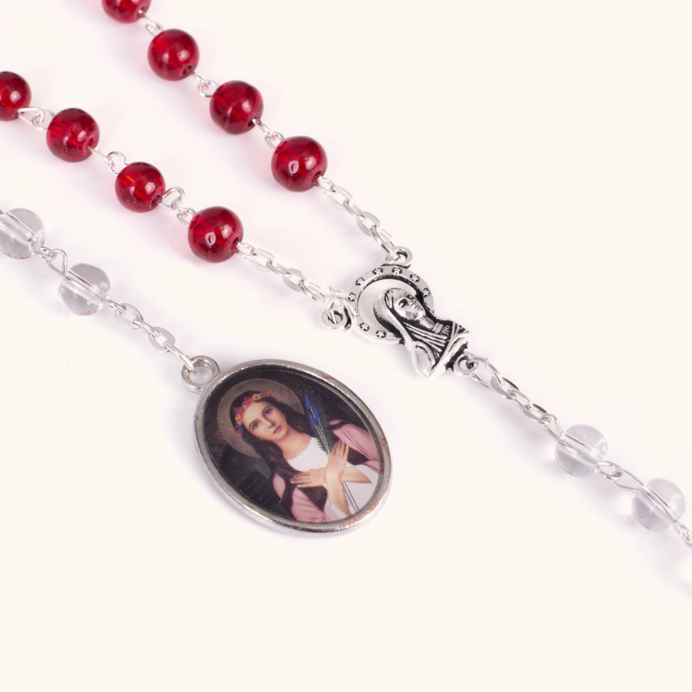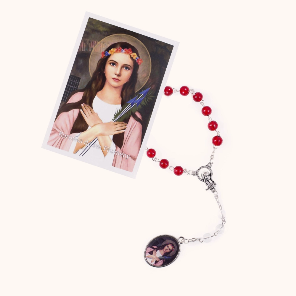 Piękna koronka składająca się z trzynastu czerwonych i trzech przezroczystych szklanych koralików o wielkości 6 mm, zawieszonych na stalowym sztyfcie. Ozdobiona medalikiem z wizerunkiem św. Filomeny oraz łącznikiem z Matką Bożą. Do zestawu dołączono szczegółową instrukcję modlitwy.
