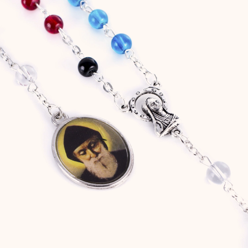 Koronka składająca się z 21 kolorowych szklanych paciorków, zawieszonych na stalowym sztyfcie. Zwieńczona medalikiem św. Charbela i łącznikiem z Matką Bożą. W zestawie instrukcja modlitwy. Trwała, estetyczna, gotowa do duchowego wsparcia.
