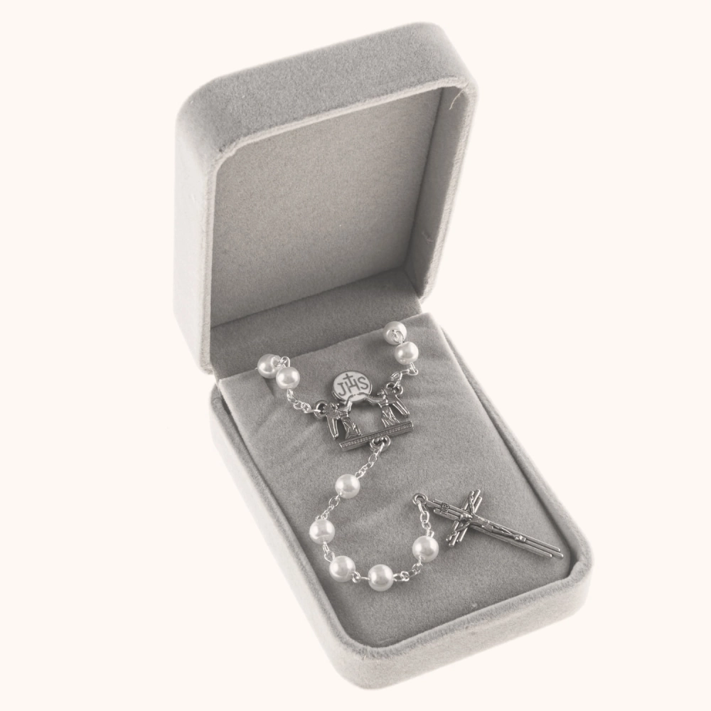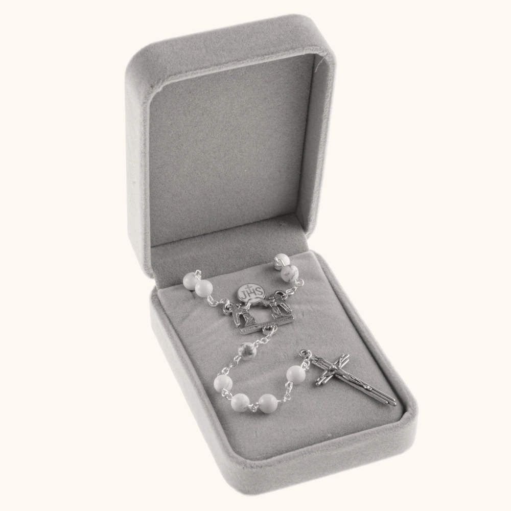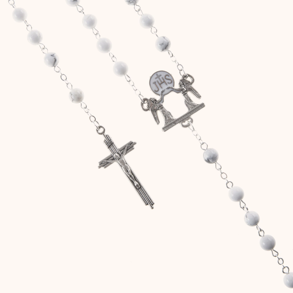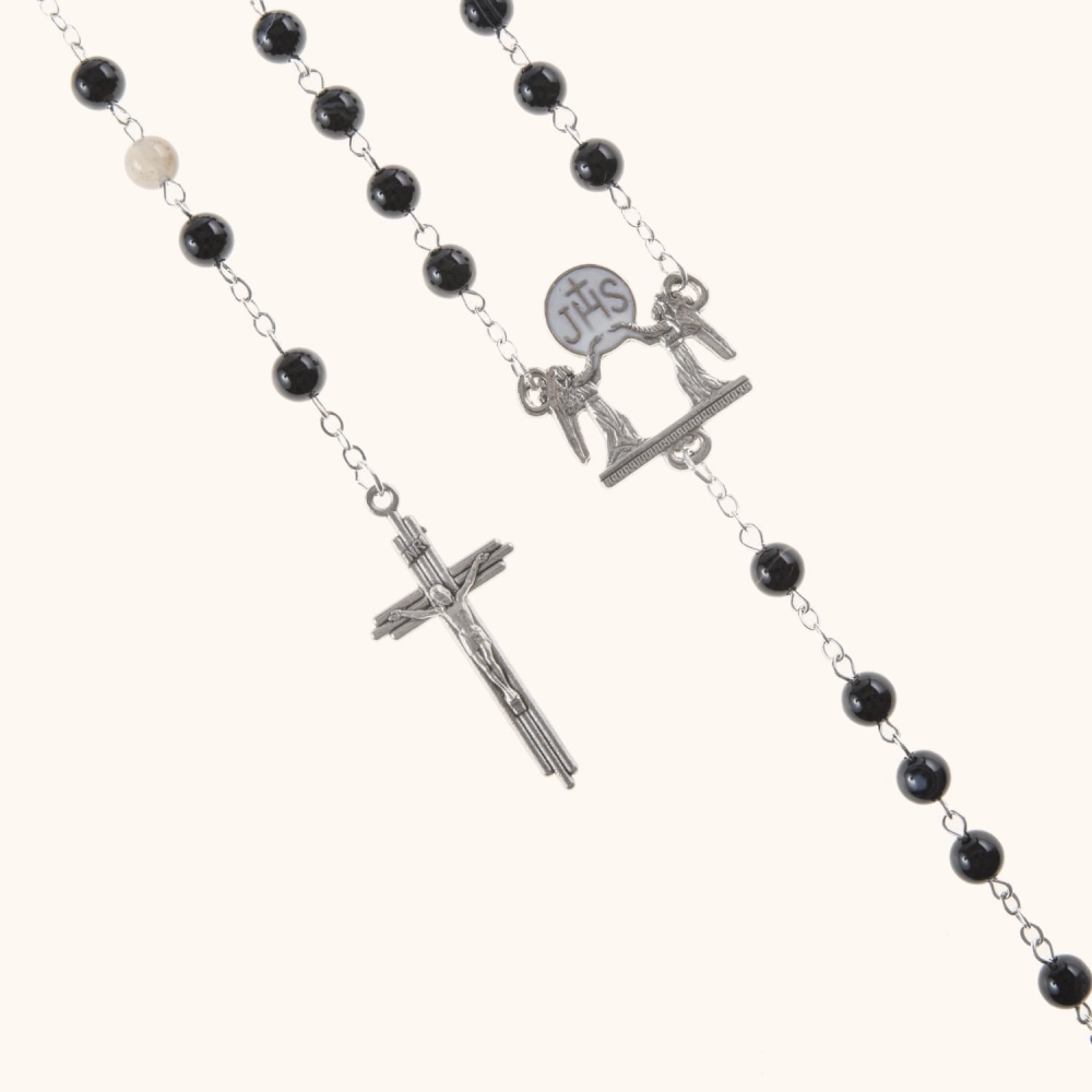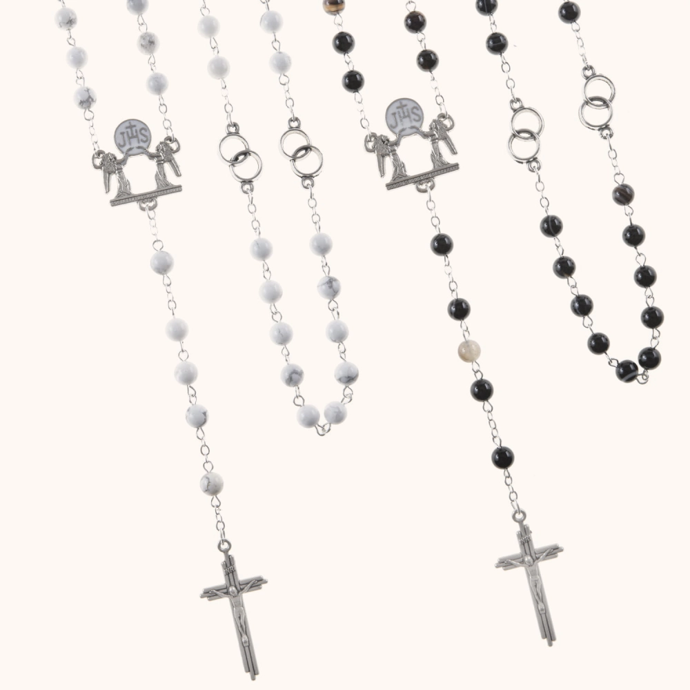 Komplet dwóch różańców ślubnych – z białego turkusu i czarnego agatu. Koraliki o średnicy 6 mm połączone są sztyftem ze stali nierdzewnej. Ozdobny łącznik z motywem JHS i aniołami. Całość zapakowana w eleganckie pudełko prezentowe.