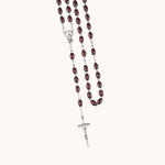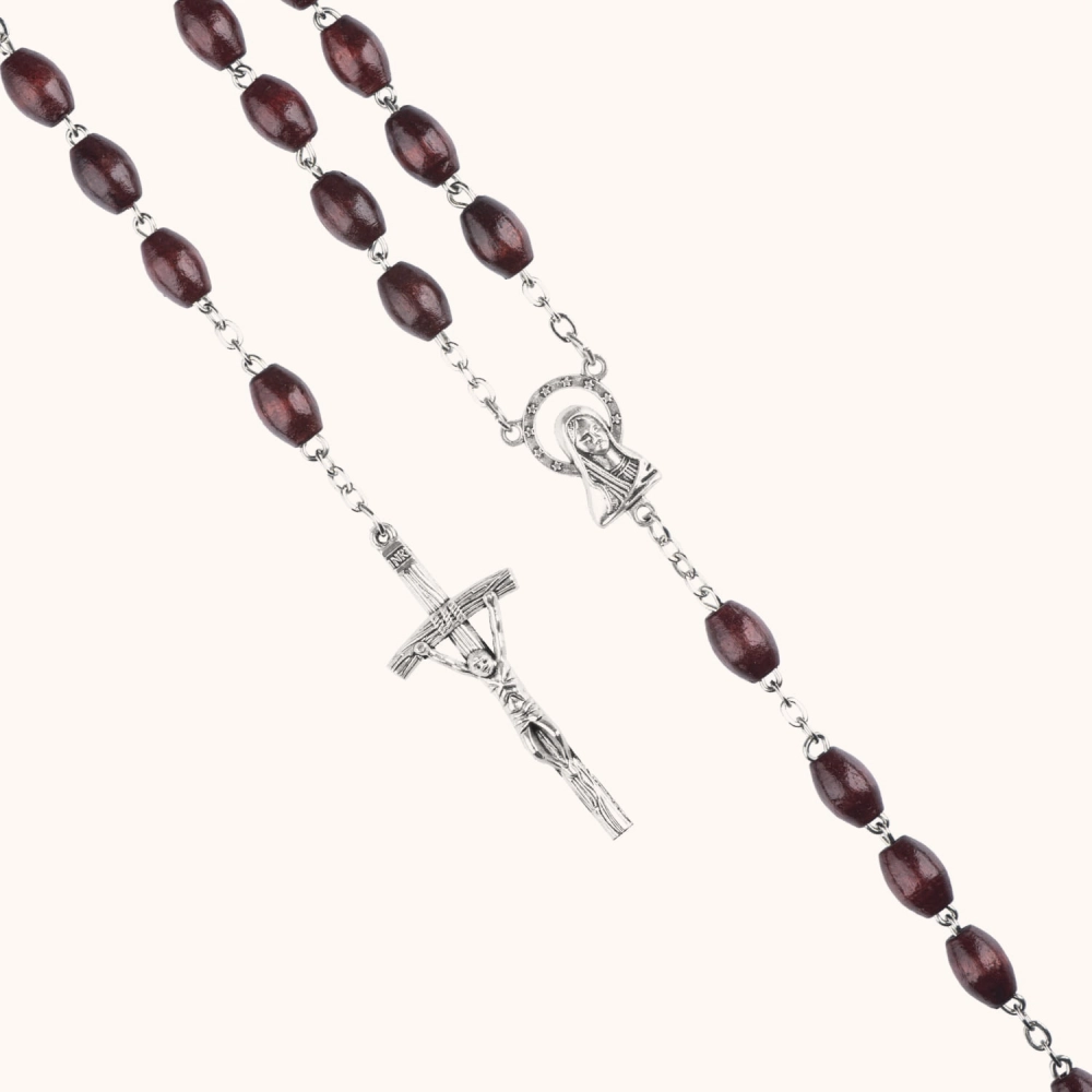 Klasyczny różaniec z owalnych drewnianych koralików (7 mm), połączonych sztyftem ze stali nierdzewnej. Z łącznikiem z wizerunkiem Matki Bożej i krzyżem inspirowanym pastorałem papieskim. Dostępny w kilku kolorach – lekki, trwały, tradycyjny.