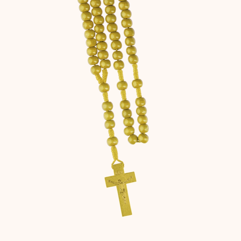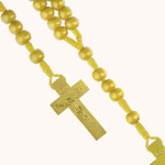 Lekki i trwały różaniec z drewnianych paciorków (8 mm), nawleczonych na solidny sznurek. Krzyżyk i sznurek w kolorze dopasowanym do paciorków. Wizerunek Chrystusa i napis INRI w kontrastującym kolorze. Dostępny w wielu wersjach kolorystycznych.