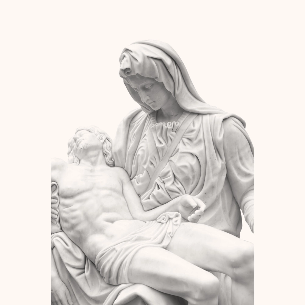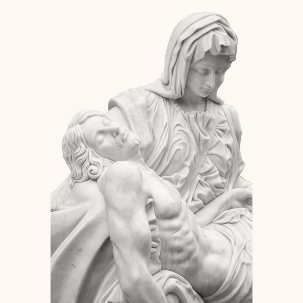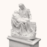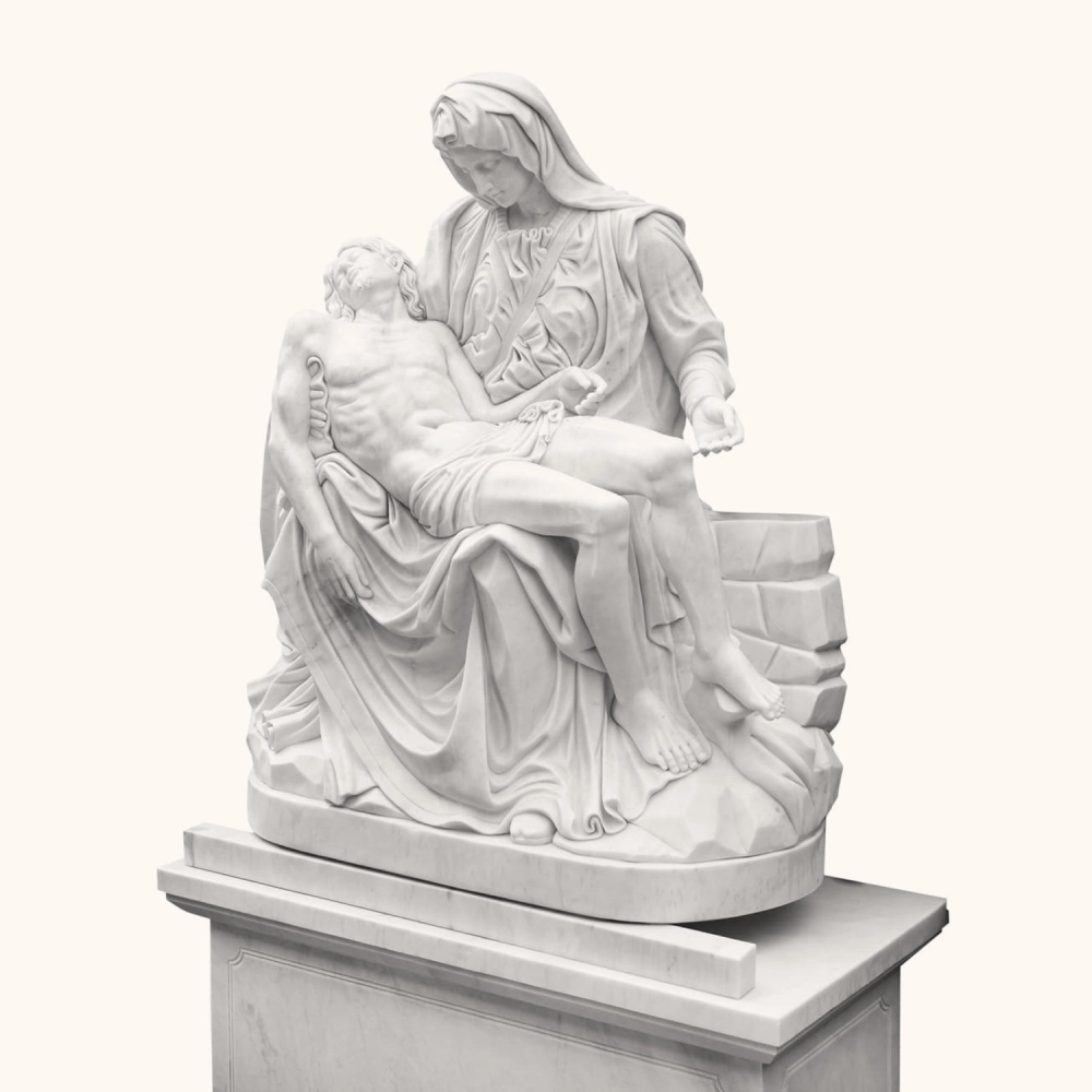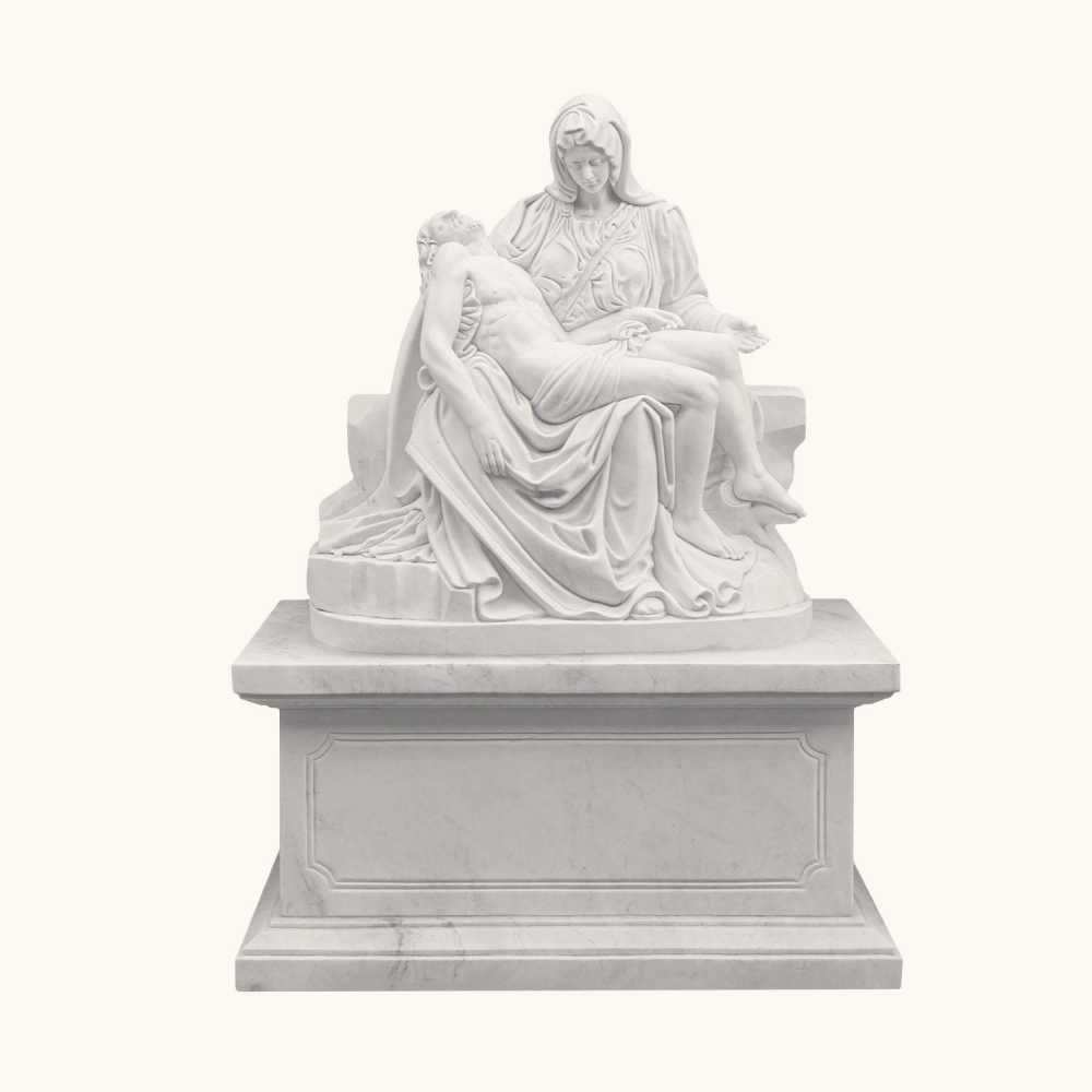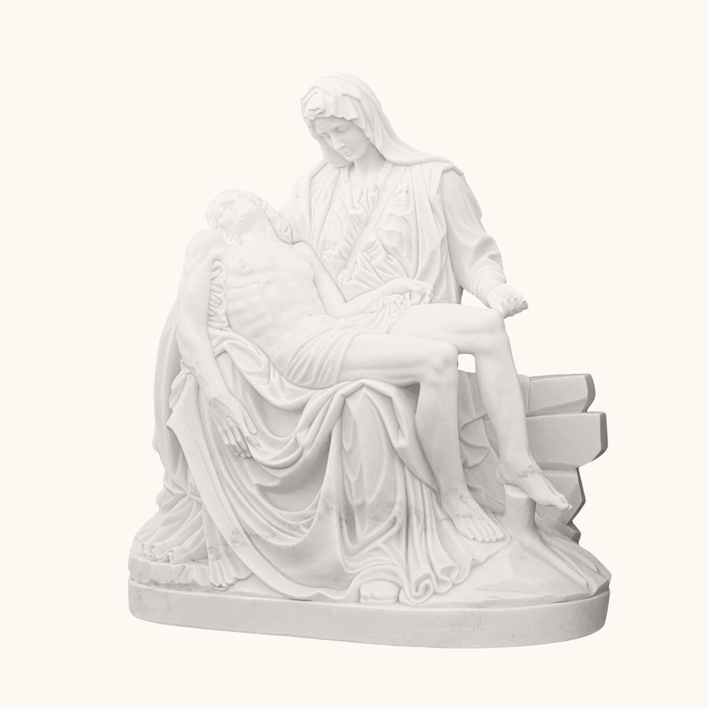 Ręcznie rzeźbiona z jednego bloku marmuru figura Piety o wysokości 170 cm. Monumentalne dzieło ukazujące Maryję tulącą ciało Chrystusa - symbol współcierpienia i miłości, która nie zna granic. Szlachetny marmur podkreśla ponadczasową godność tej sceny. Odporna na warunki atmosferyczne.