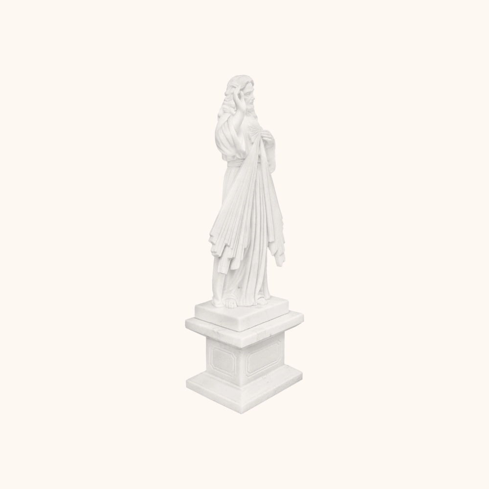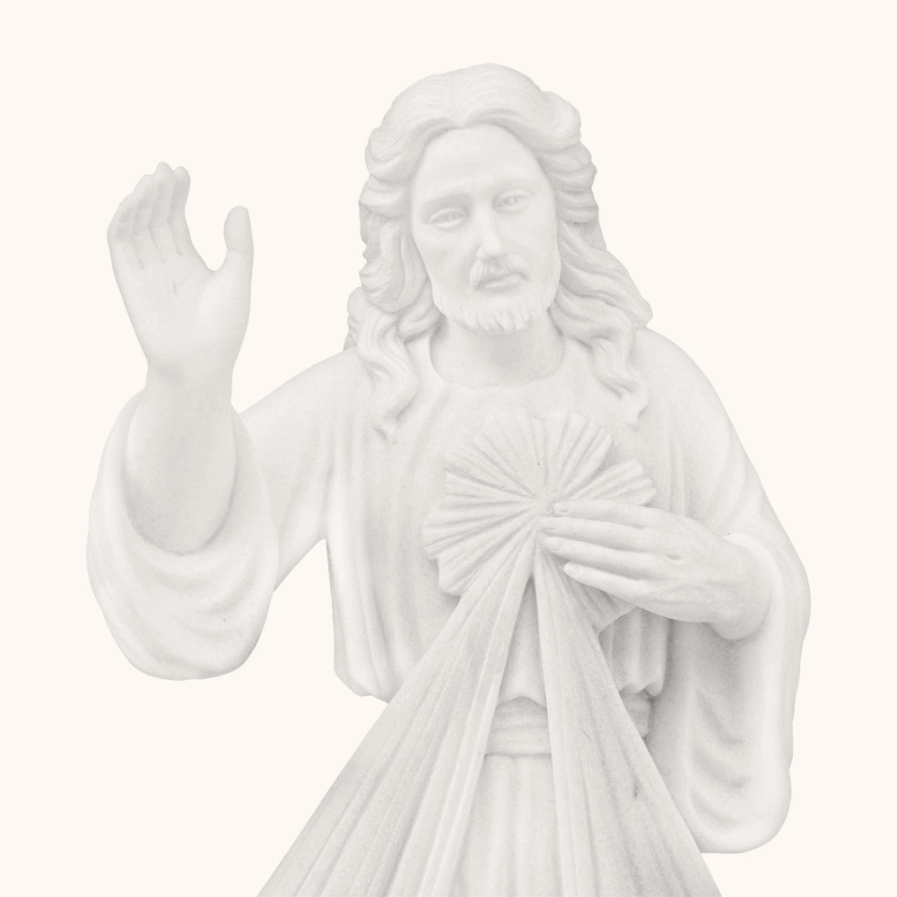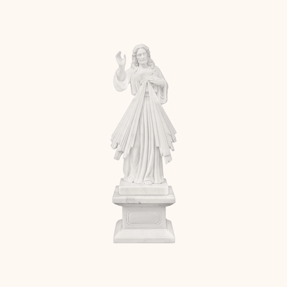 Ręcznie rzeźbiona z jednego bloku marmuru figura o wysokości 80 cm. Przedstawia Jezusa Miłosiernego w geście błogosławieństwa, z promieniami miłości wypływającymi z Jego serca. Subtelna i elegancka forma podkreśla duchową głębię. Odporna na warunki atmosferyczne, idealna do wnętrz sakralnych i przestrzeni ogrodowych.
