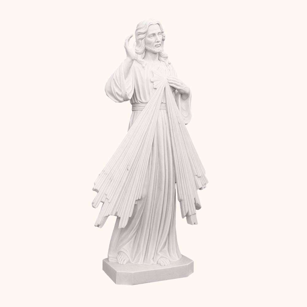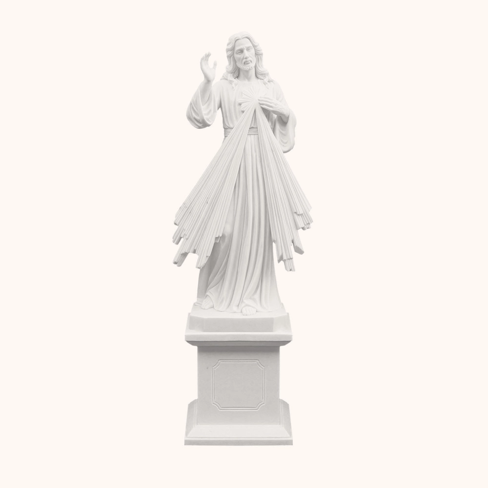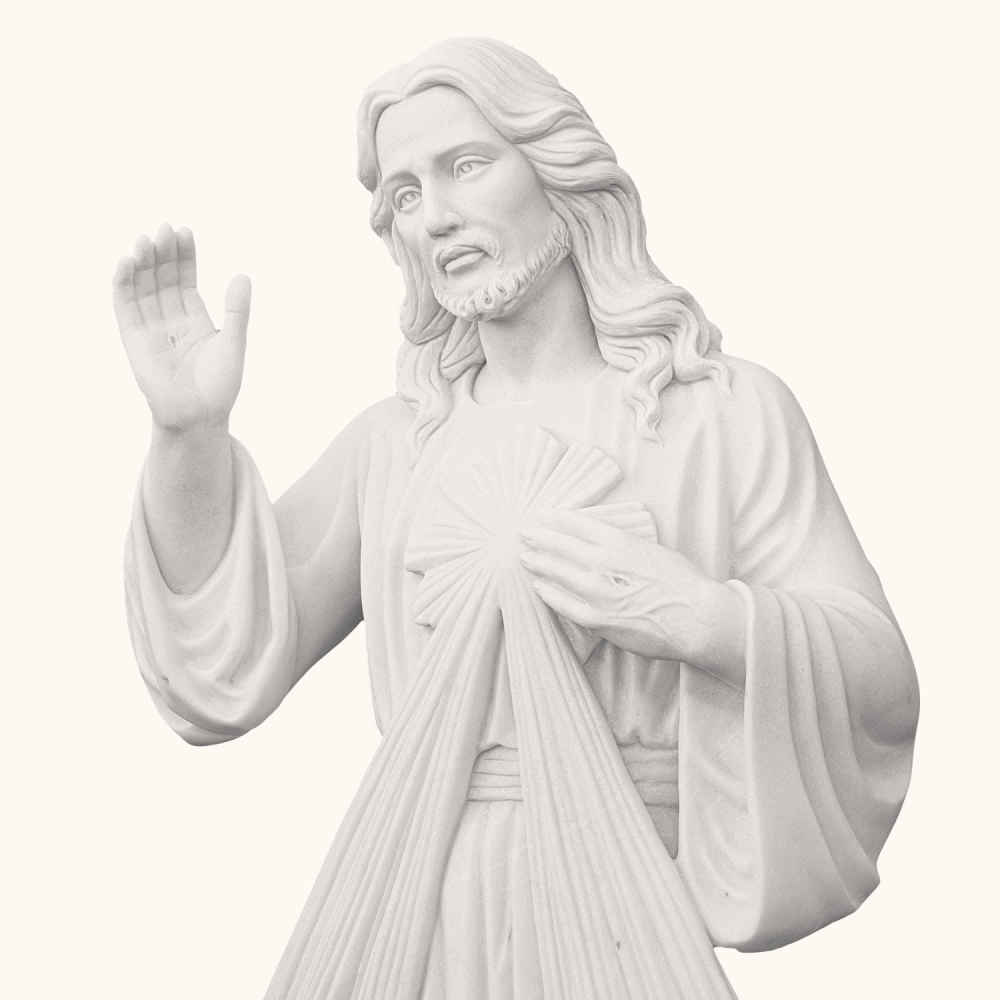 Ręcznie rzeźbiona z jednego bloku marmuru figura o wysokości 160 cm. Przedstawia Jezusa Miłosiernego w geście błogosławieństwa, z promieniami miłości wypływającymi z Jego serca. Symbol łaski, pokoju i przebaczenia. Odporna na warunki atmosferyczne, idealna do kościołów, ogrodów i miejsc modlitwy.