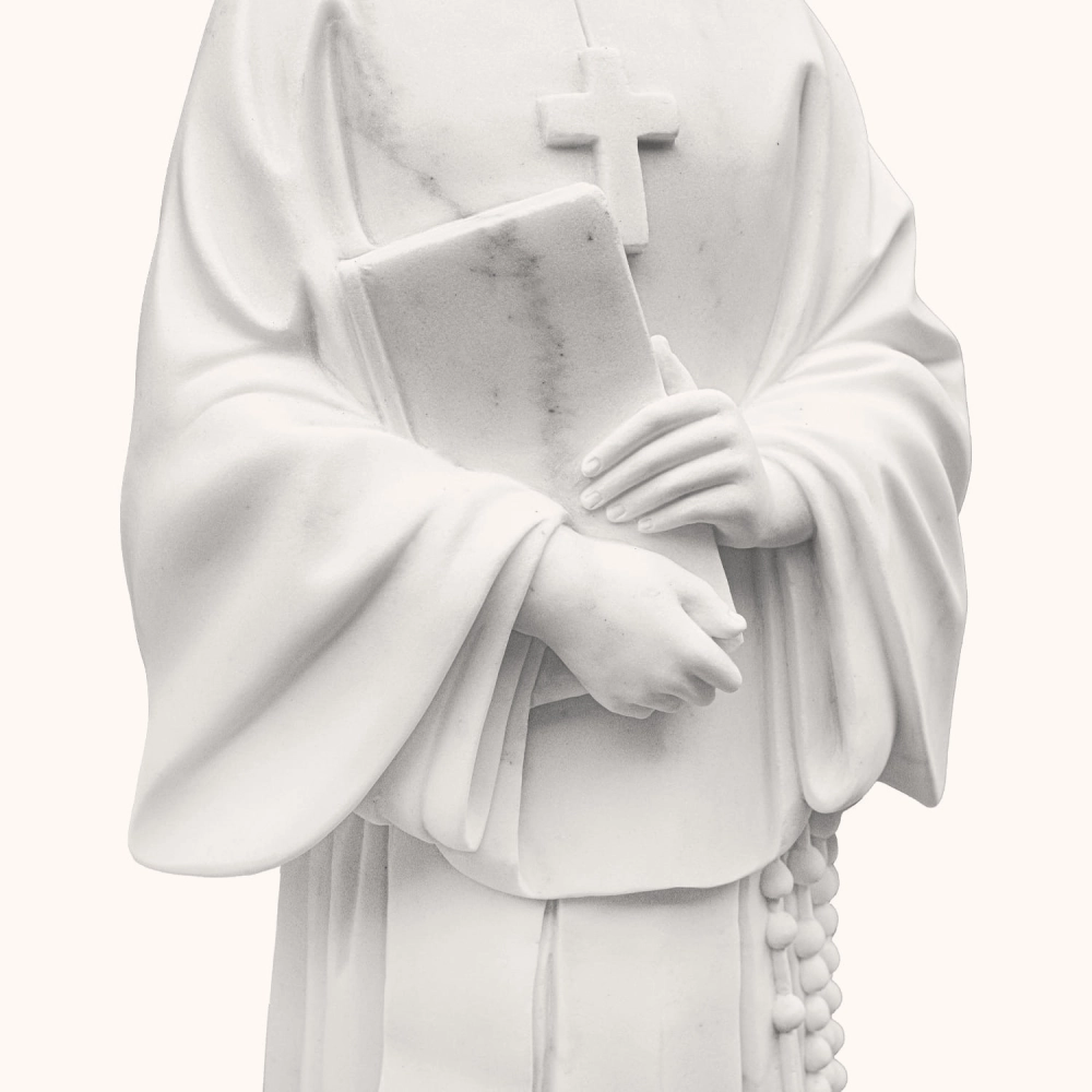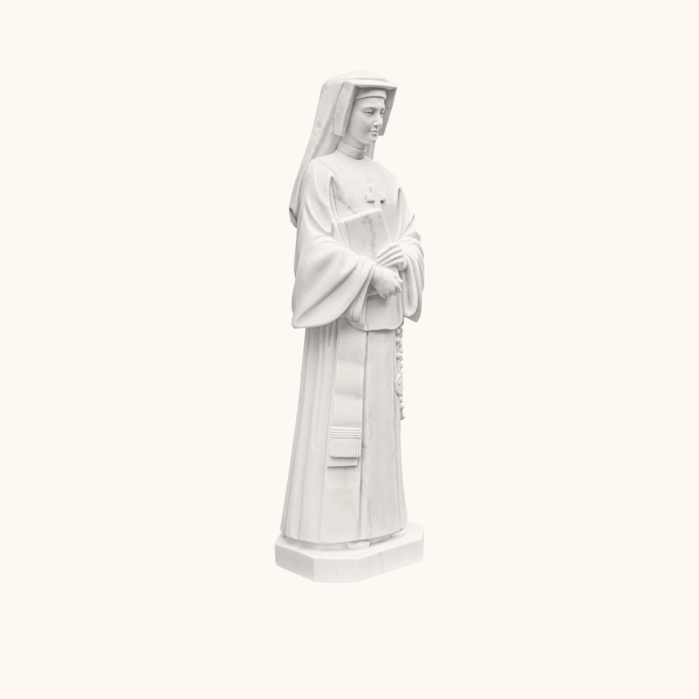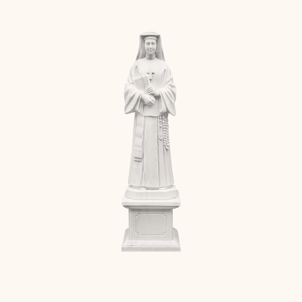 Ręcznie rzeźbiona figura z jednego bloku marmuru o wysokości 120 cm. Przedstawia św. Faustynę Kowalską - apostołkę Bożego Miłosierdzia, trzymającą różaniec i modlitewną księgę. Pełna spokoju i duchowej głębi. Odporna na warunki atmosferyczne, doskonała do kaplic, ogrodów i przestrzeni sakralnych.