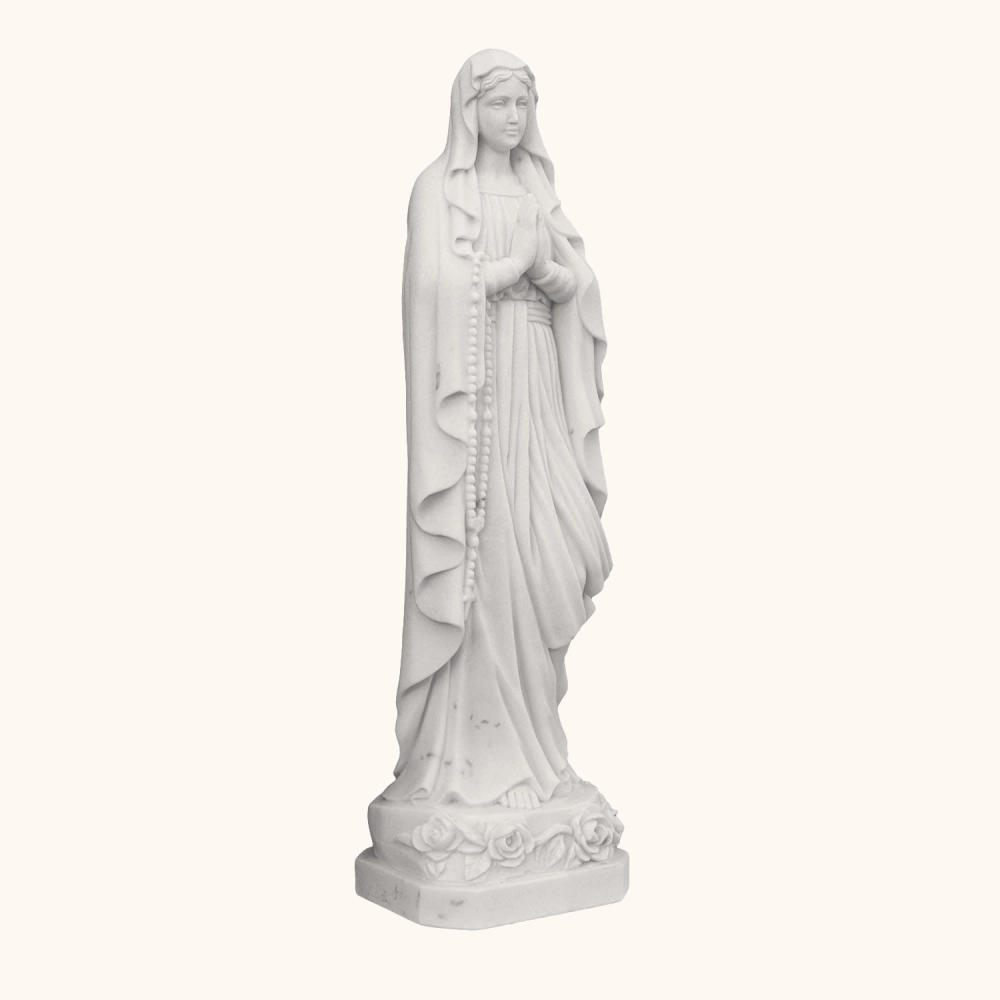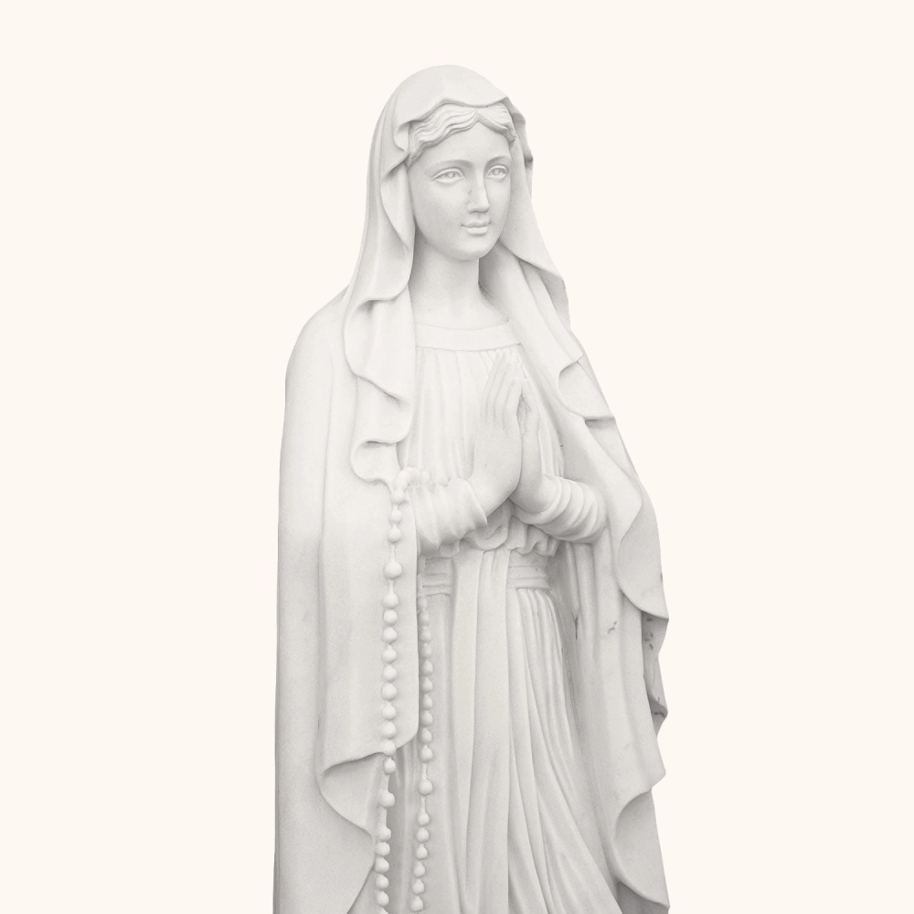 Ręcznie rzeźbiona figura o wysokości 100 cm, wykonana z jednego bloku marmuru, przedstawiająca Matkę Bożą Różańcową z różańcem w dłoniach - w geście modlitwy i zawierzenia.