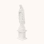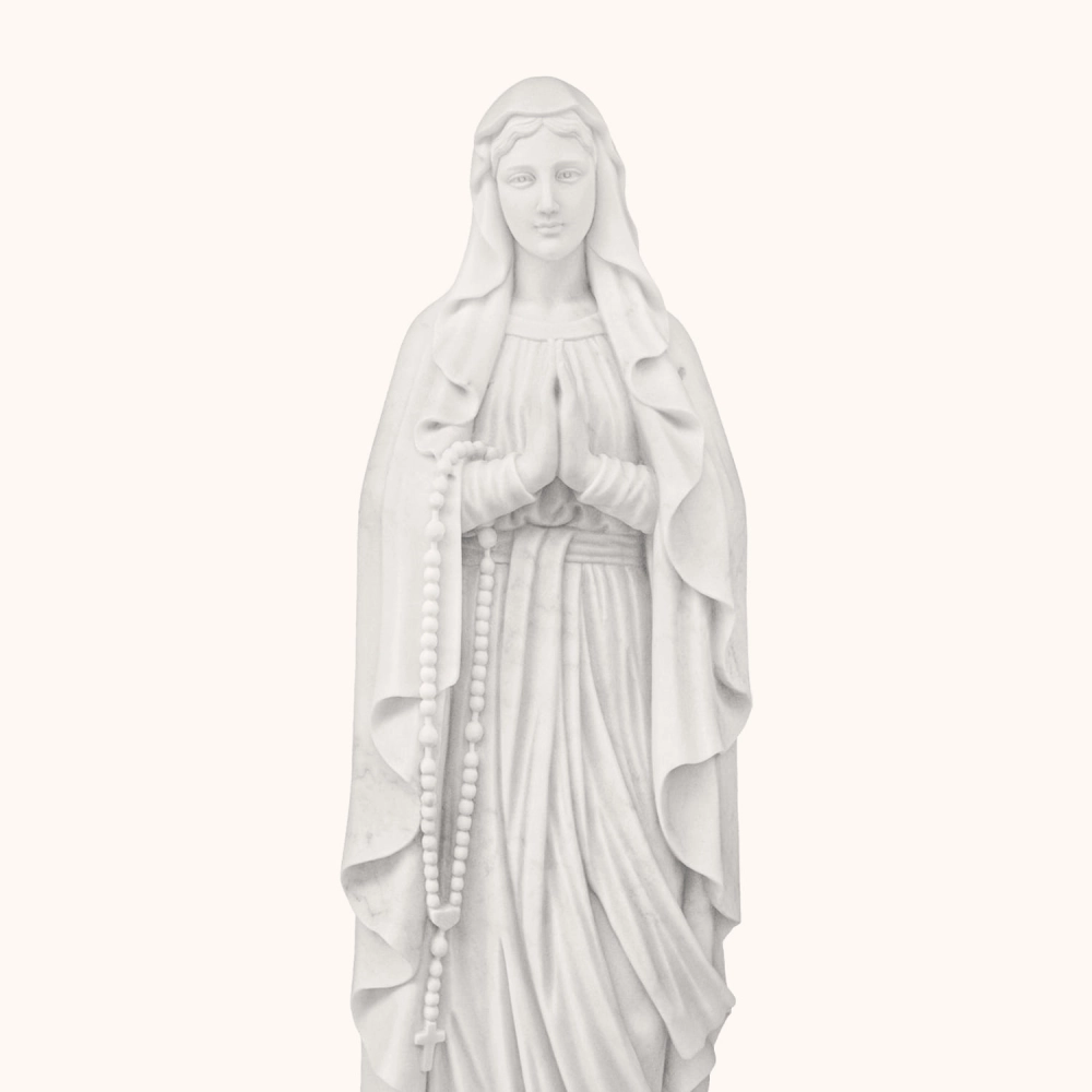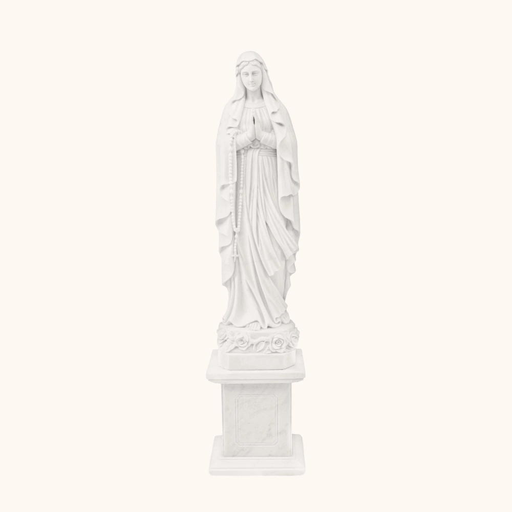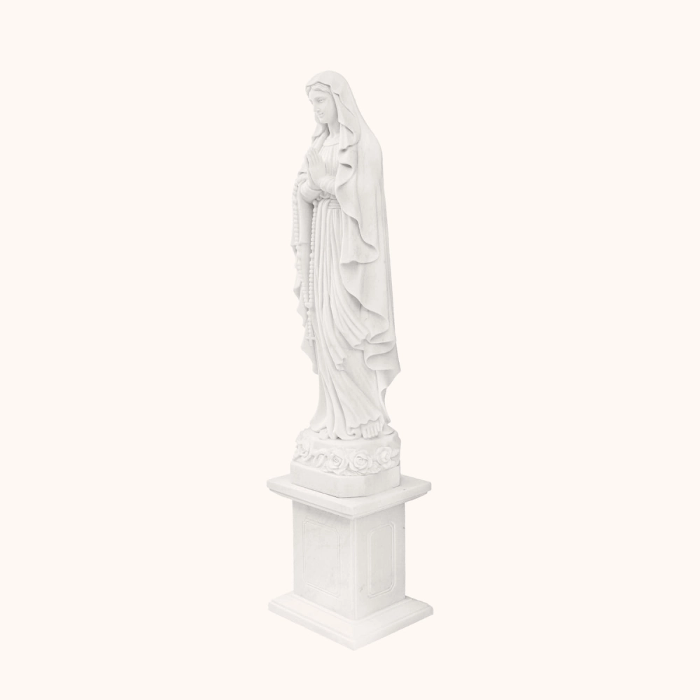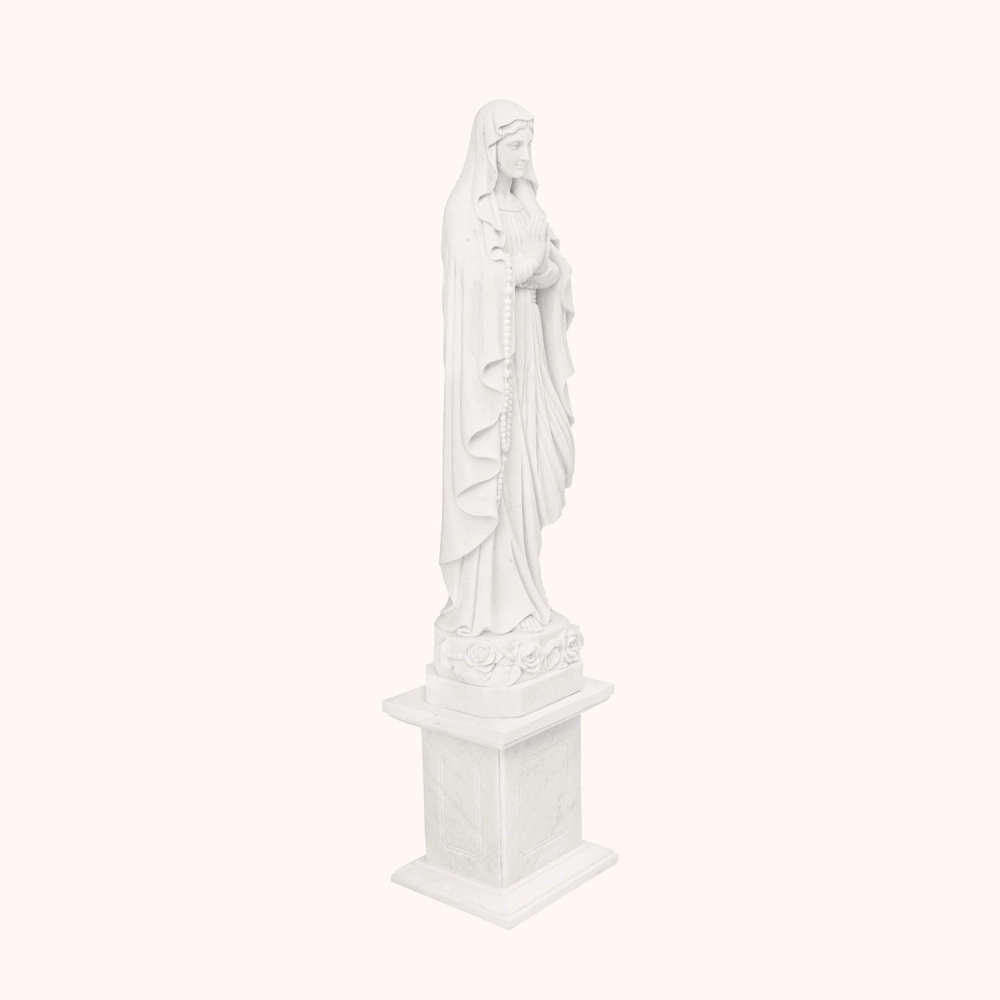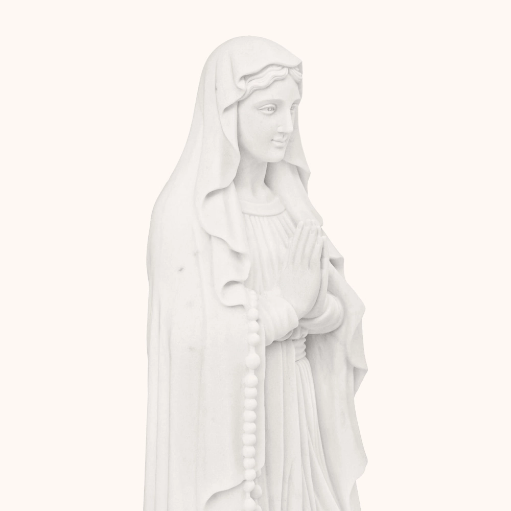 Ręcznie rzeźbiona figura o wysokości 160 cm, wykonana z jednego bloku marmuru, przedstawiająca Matkę Bożą Różańcową z modlitewnym różańcem w dłoniach.