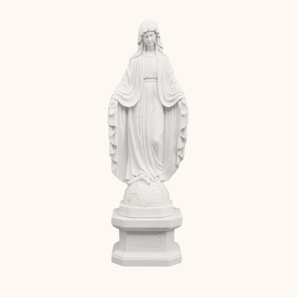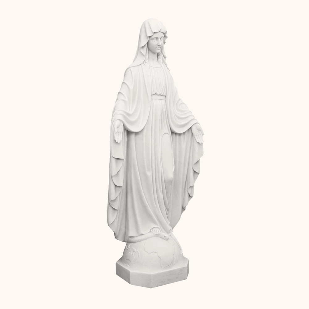 Ręcznie rzeźbiona figura o wysokości 120 cm, wykonana z jednego bloku marmuru, przedstawiająca Matkę Bożą Niepokalaną stojącą na kuli ziemskiej z wężem u stóp - znakiem zwycięstwa nad grzechem.