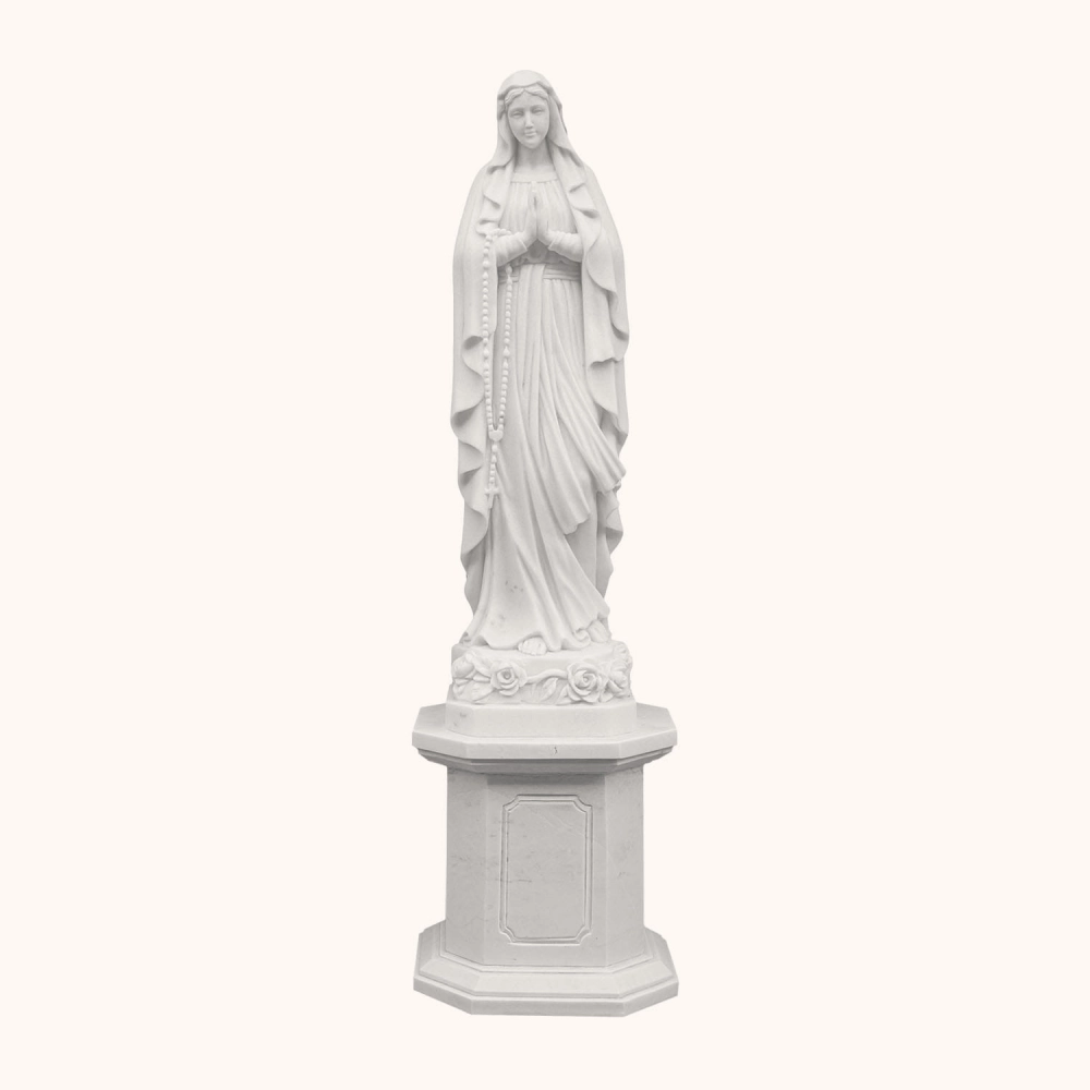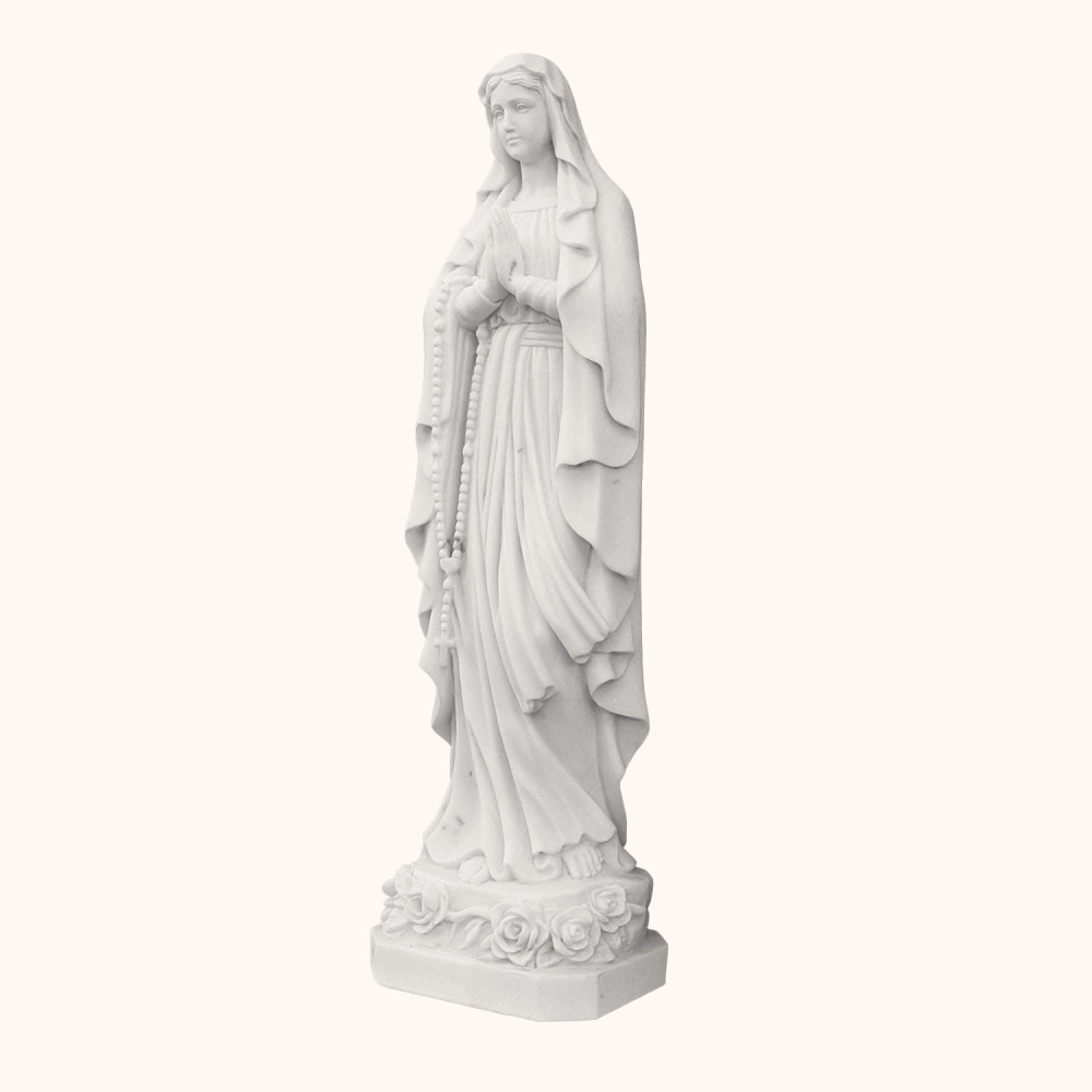 Ręcznie rzeźbiona figura o wysokości 120 cm, wykonana z jednego bloku marmuru, przedstawiająca Matkę Bożą Różańcową z różańcem w dłoniach.