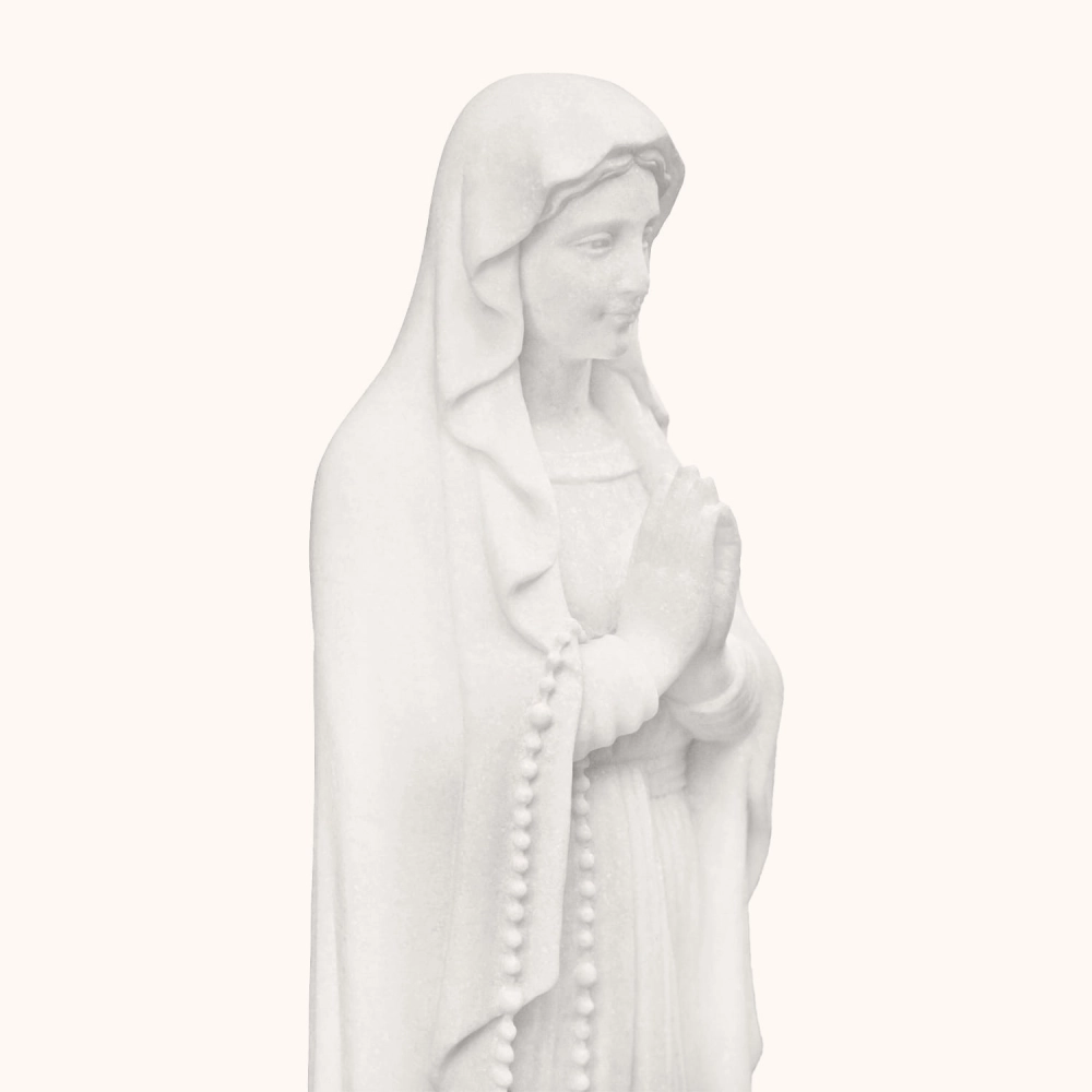 Ręcznie rzeźbiona figura o wysokości 80 cm, wykonana z jednego bloku marmuru, przedstawiająca Matkę Bożą Różańcową.