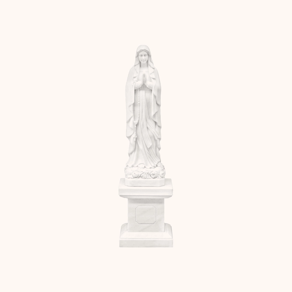 Subtelne detale, delikatny wyraz twarzy i harmonijne proporcje nadają jej wyjątkową szlachetność. Idealna do kaplic, ogrodów i miejsc modlitwy - symbol modlitwy i pokoju utrwalony w kamieniu.
