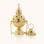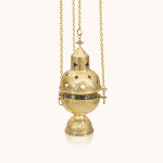 Trybularz wykonany z mosiądzu o wysokości 21 cm. Posiada ażurową pokrywę z otworami w kształcie krzyży i gwiazd oraz solidne łańcuszki. Lekki, poręczny i trwały - doskonały do codziennego użytku w liturgii i nabożeństwach.