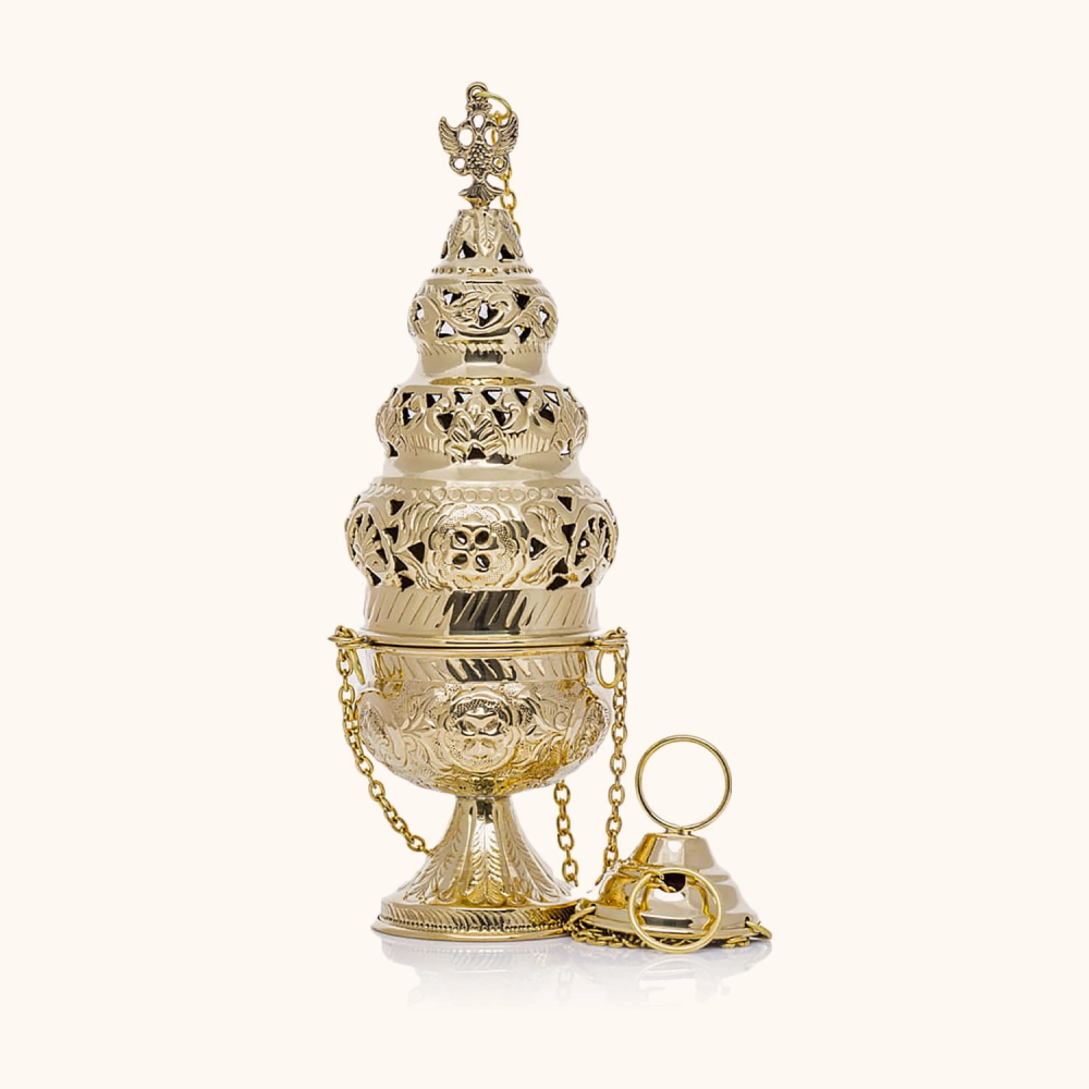 Trybularz wykonany z mosiądzu o wysokości 29 cm. Posiada bogato perforowaną pokrywę i zwieńczenie w formie krzyża. Wyposażony w solidny łańcuszek i stabilną podstawę. Elegancki, trwały i starannie wykonany – idealny do uroczystych celebracji liturgicznych.