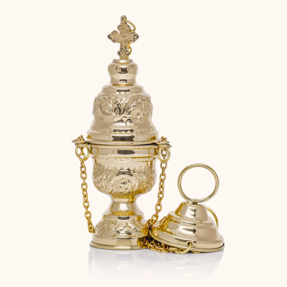 Trybularz wykonany z mosiądzu o wysokości 21 cm. Zdobiony precyzyjnym grawerunkiem i zwieńczony krzyżem. Wyposażony w solidny łańcuszek i stabilną podstawę. Elegancki, trwały i funkcjonalny – odpowiedni do liturgii i nabożeństw.