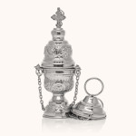 Trybularz wykonany z mosiądzu z niklowanym wykończeniem. Wysokość: 20 cm. Ozdobiony precyzyjnym grawerunkiem i zakończony krzyżem. Posiada solidny łańcuszek i stabilną podstawę. Trwały, elegancki i funkcjonalny – przeznaczony do codziennego użytku liturgicznego.