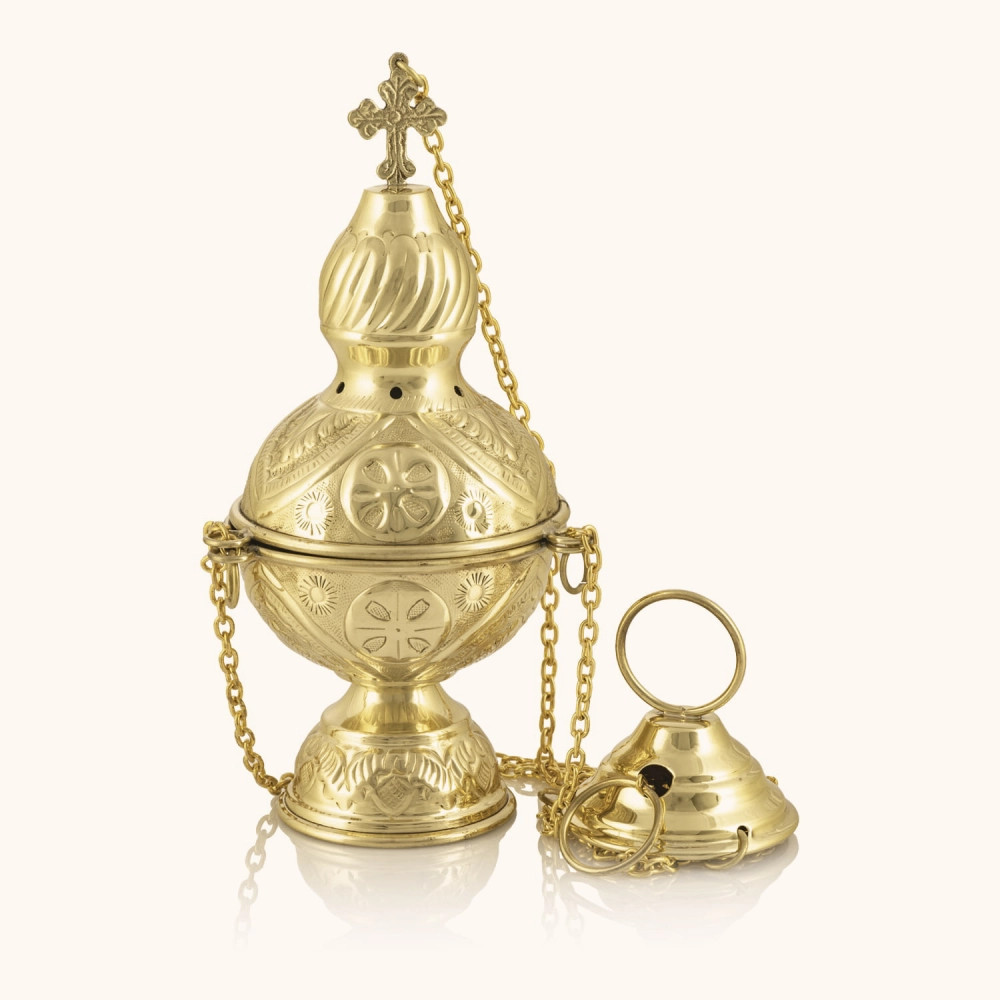 Trybularz wykonany z mosiądzu o wysokości 23 cm. Zdobiony misternym grawerunkiem i zwieńczony krzyżem. Wyposażony w solidny łańcuszek i stabilną podstawę. Elegancki, trwały i starannie wykończony – idealny do uroczystych celebracji liturgicznych.