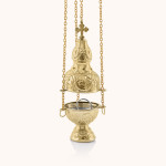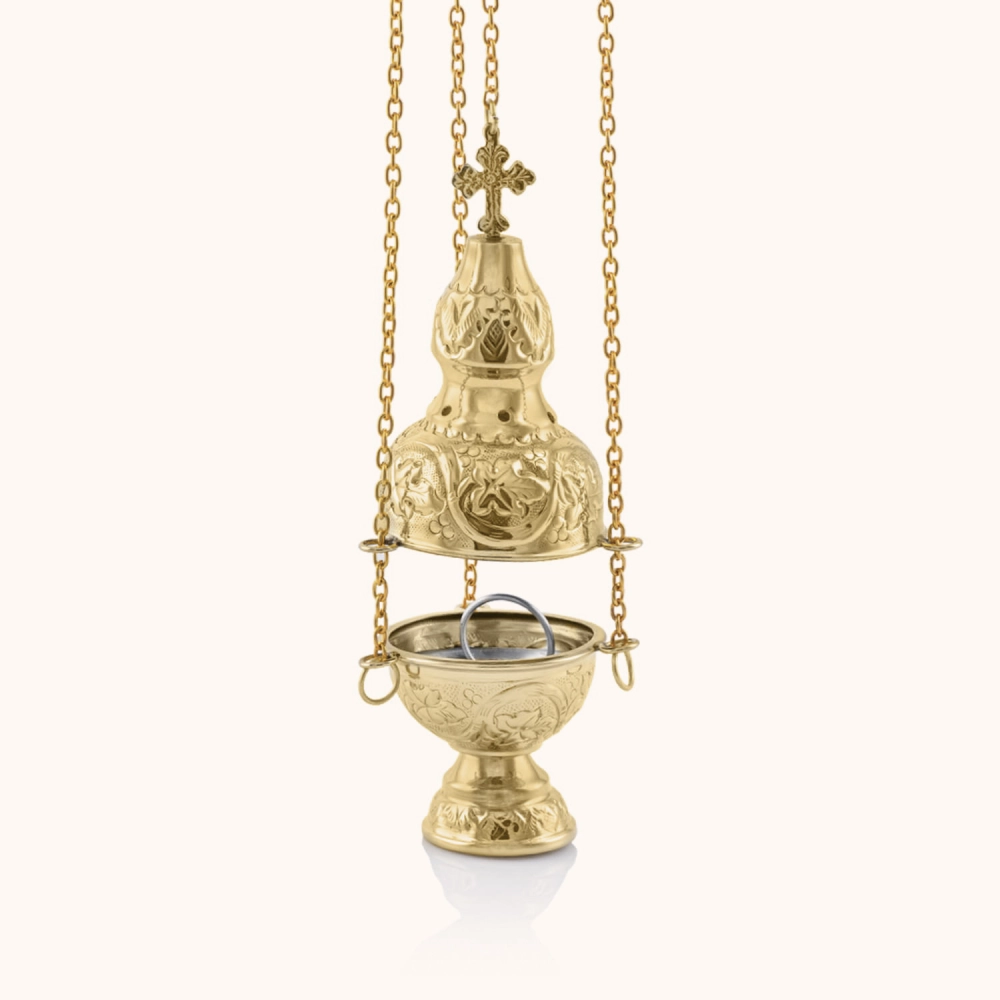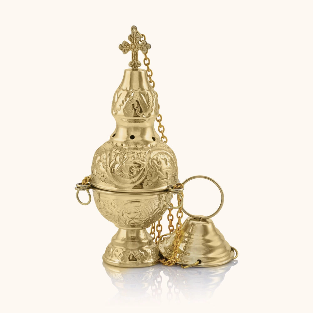 Trybularz wykonany z mosiądzu o wysokości 21 cm. Zdobiony precyzyjnym grawerunkiem i zakończony krzyżem. Wyposażony w solidny łańcuszek oraz stabilną podstawę. Trwały, estetyczny i praktyczny – idealny do codziennego użytku liturgicznego.