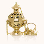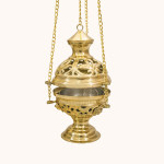 Trybularz wykonany z mosiądzu o wysokości 24 cm. Posiada ażurową konstrukcję z dekoracyjnymi wycięciami i solidnym łańcuszkiem. Elegancki, trwały i funkcjonalny – idealny do liturgii, nabożeństw i procesji.