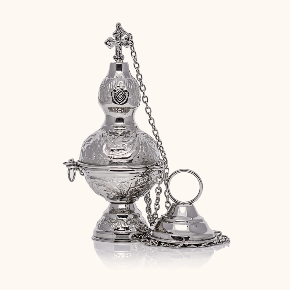 Trybularz wykonany z mosiądzu z niklowanym wykończeniem. Wysokość: 20 cm. Ozdobiony delikatnym grawerunkiem i zwieńczony krzyżem. Wyposażony w łańcuszek, trwały i estetyczny. Doskonały do liturgii i codziennego użytku w kaplicach i kościołach.