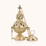 Trybularz wykonany z mosiądzu o wysokości 22 cm. Ażurowa pokrywa z krzyżem i precyzyjne zdobienia nadają mu elegancki wygląd. Wyposażony w solidny łańcuszek, stabilny i wygodny w użyciu. Idealny do codziennych celebracji liturgicznych i uroczystych nabożeństw.