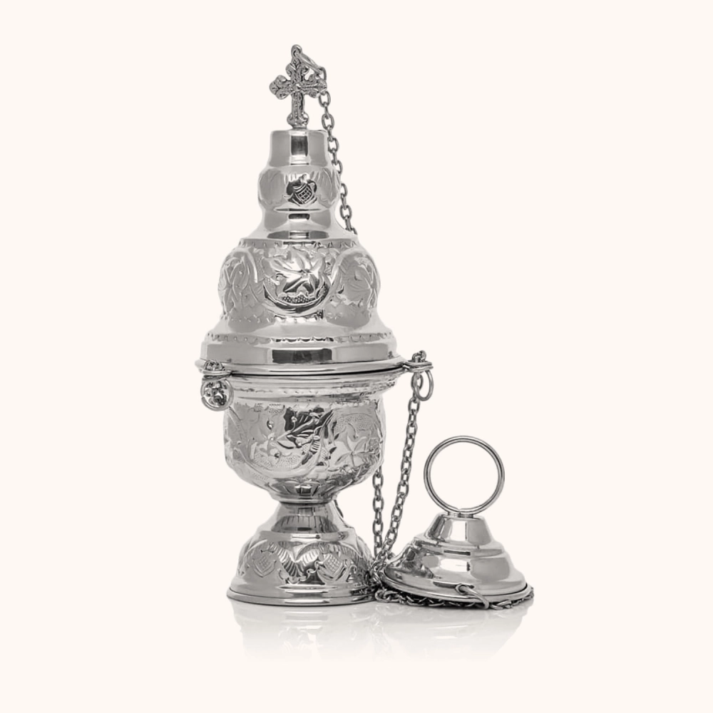 Trybularz wykonany z mosiądzu z niklowanym wykończeniem. Wysokość: 24 cm. Zdobiony precyzyjnym grawerunkiem i zakończony krzyżem. Wyposażony w solidny łańcuszek i stabilną podstawę. Elegancki, trwały i funkcjonalny – idealny do liturgii i procesji.