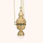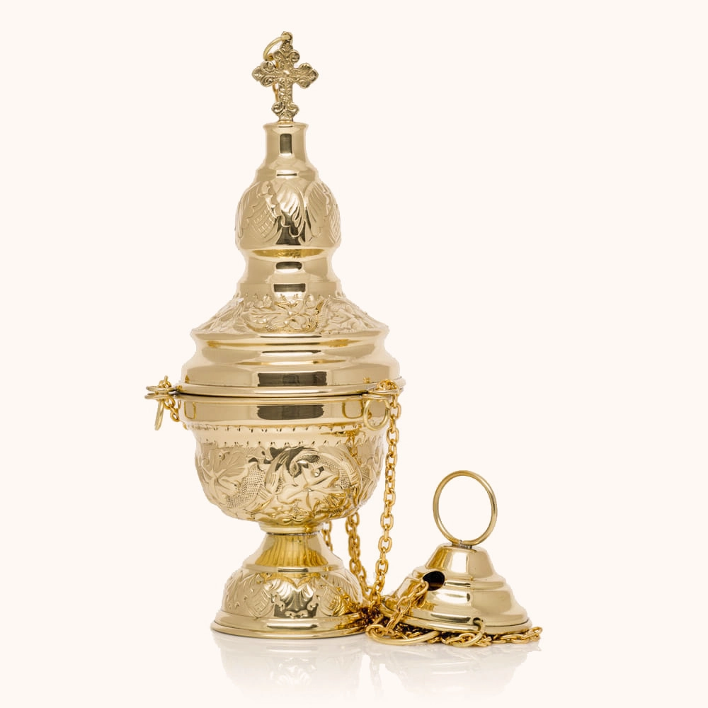 Trybularz wykonany z mosiądzu o wysokości 24 cm. Bogato zdobiony, z misternymi grawerunkami i pokrywą zakończoną krzyżem. Posiada solidny łańcuszek i stabilną podstawę. Trwały, elegancki i dopracowany w detalach – idealny do uroczystych celebracji liturgicznych.
