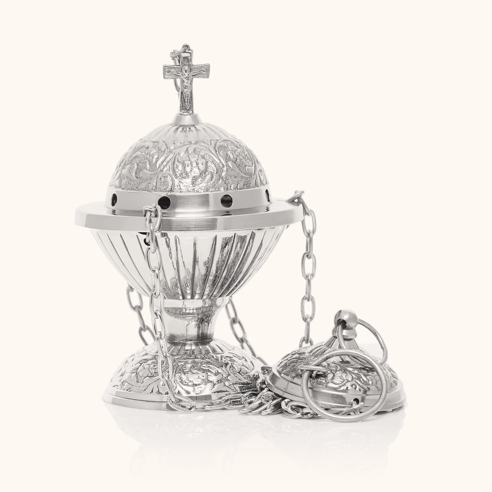 Trybularz wykonany z mosiądzu z niklowanym wykończeniem. Wysokość: 21 cm. Bogato zdobiony, z pokrywą zakończoną krzyżem i ozdobną podstawą. Trwały, elegancki i precyzyjnie wykonany - idealny do uroczystych celebracji liturgicznych.