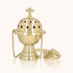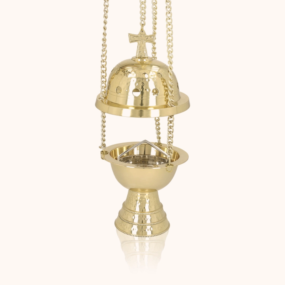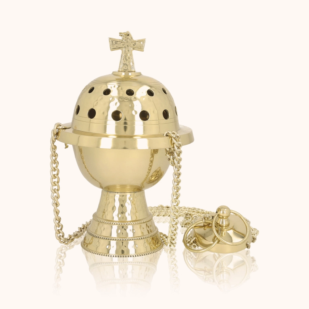 Trybularz wykonany z mosiądzu o wysokości 20 cm. Posiada pokrywę z otworami wentylacyjnymi i krzyżem na szczycie. Stabilna podstawa i solidny łańcuszek zapewniają wygodne użytkowanie. Estetyczny, trwały i funkcjonalny - idealny do liturgii i nabożeństw.
