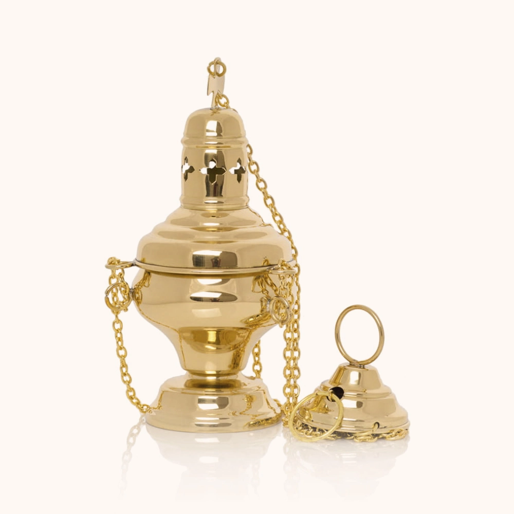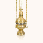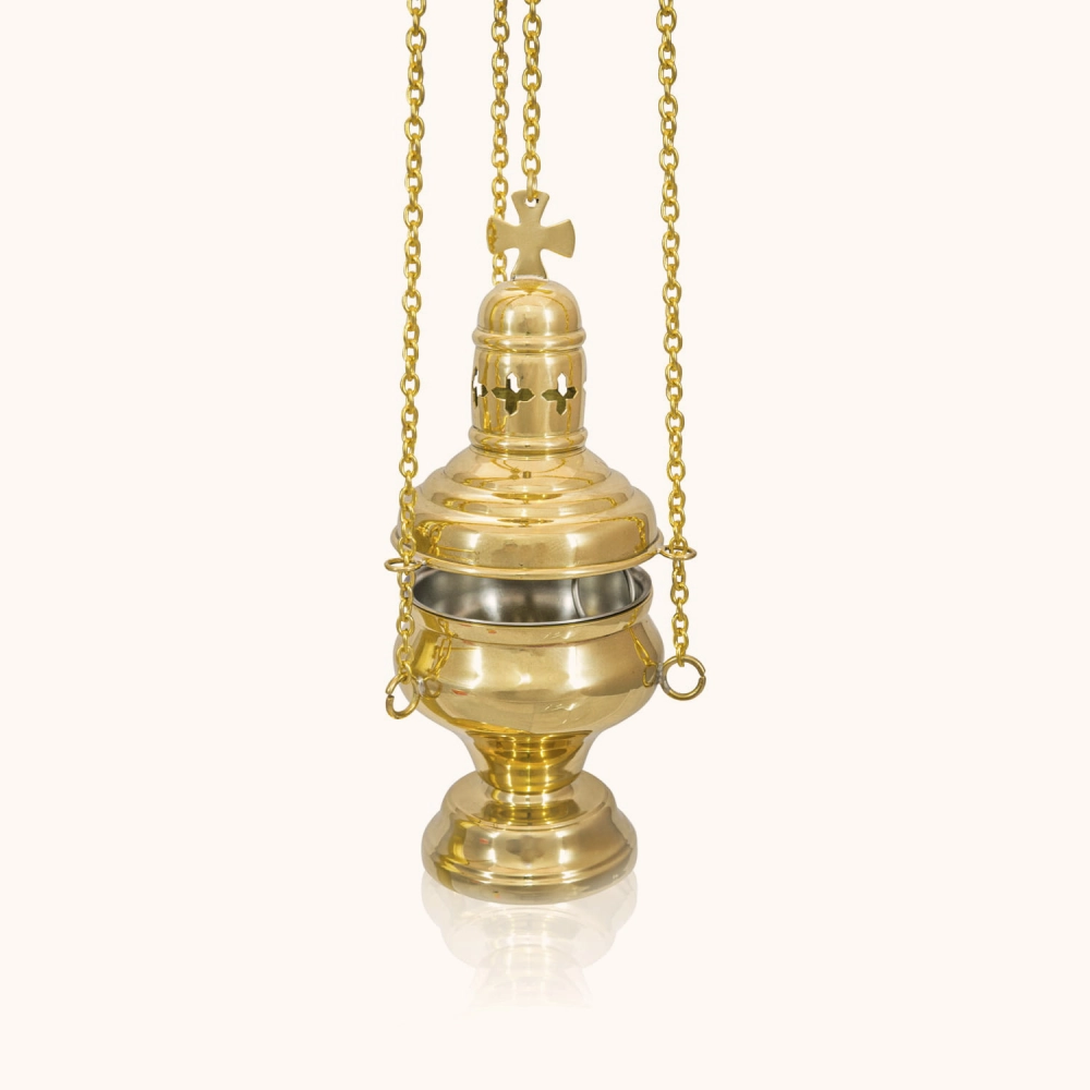 Trybularz wykonany z mosiądzu o wysokości 22 cm. Ma prostą, klasyczną formę i gładką powierzchnię. Wyposażony w łańcuszek i pokrywę z otworami wentylacyjnymi. Trwały, estetyczny i praktyczny – idealny do codziennego użytku w liturgii.