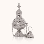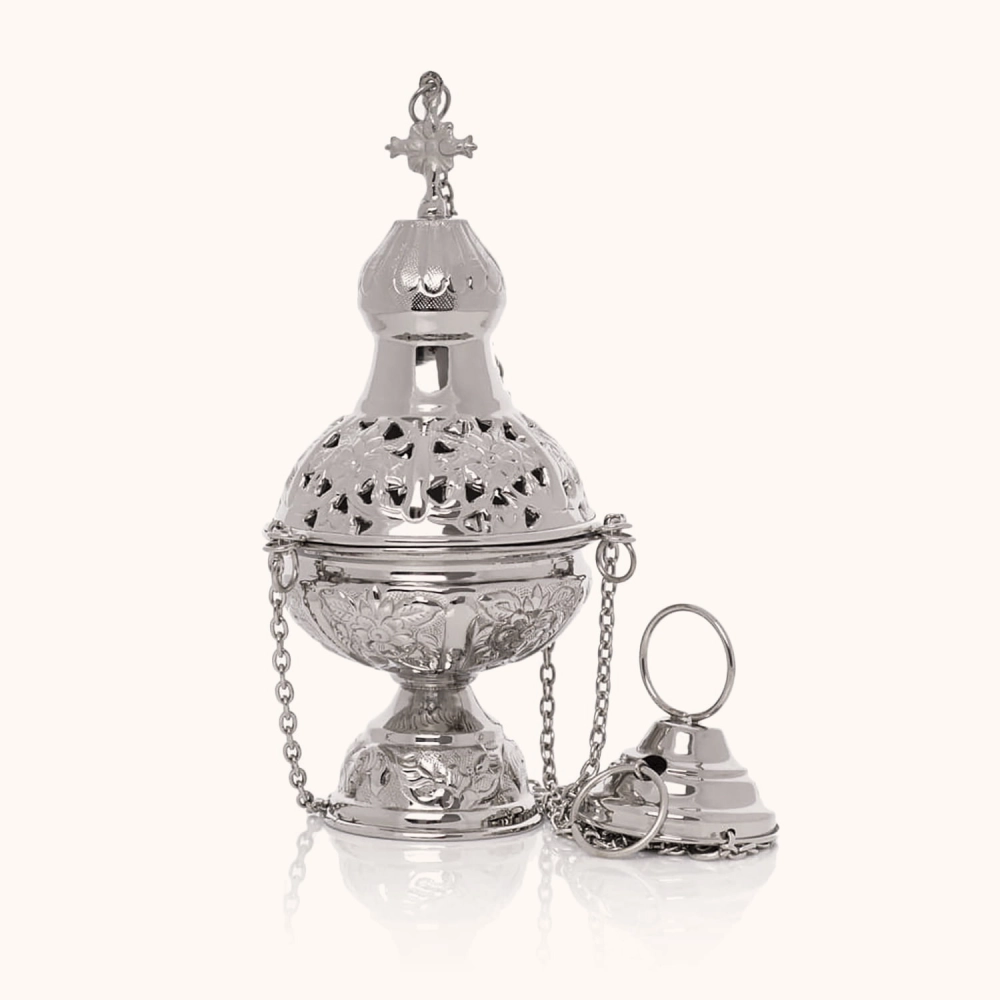 Trybularz wykonany z mosiądzu z niklowanym wykończeniem. Wysokość: 24 cm. Bogato zdobiony, z ażurowymi detalami i krzyżem na pokrywie. Wyposażony w solidny łańcuszek, trwały i estetyczny - doskonały do uroczystych liturgii i procesji.