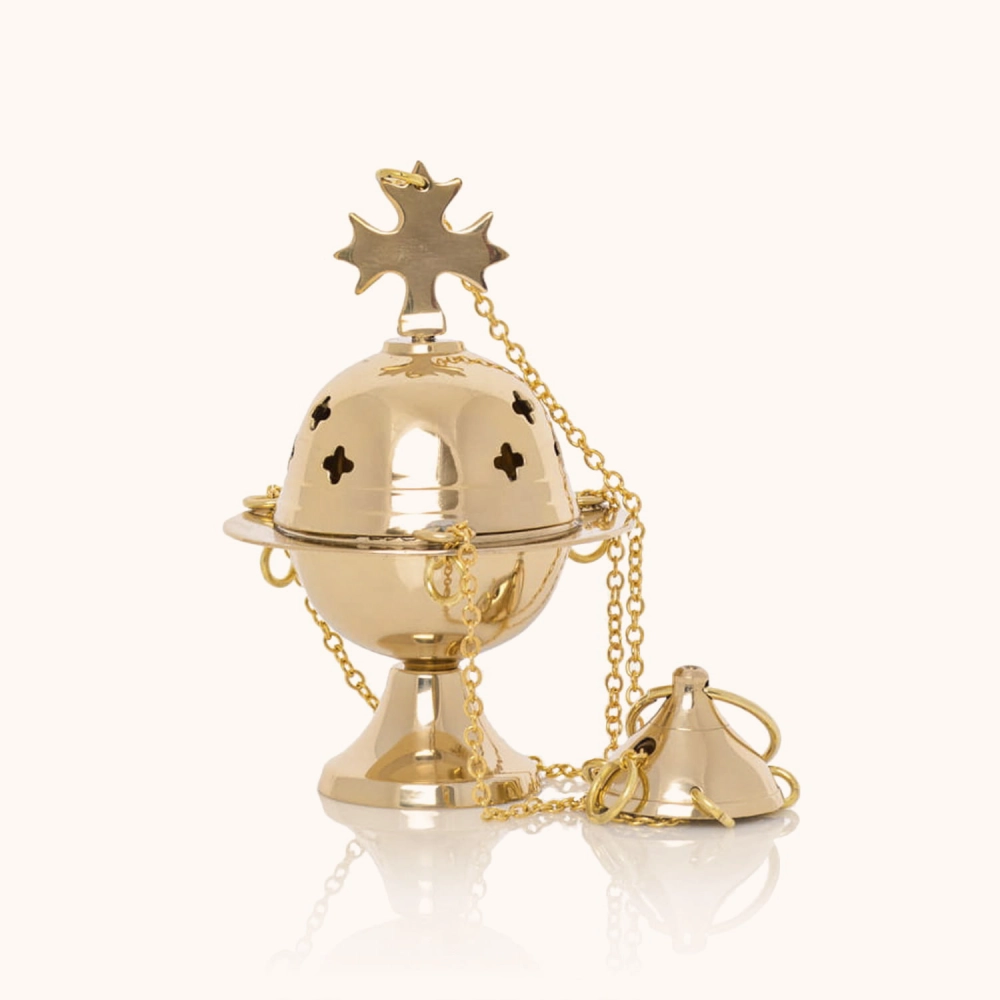 Trybularz wykonany z mosiądzu o wysokości 13 cm. Posiada pokrywę z wycięciami w kształcie krzyża i ozdobne zakończenie. Wyposażony w łańcuszek, lekki i poręczny. Doskonały do mniejszych ołtarzy, kaplic i nabożeństw okolicznościowych.