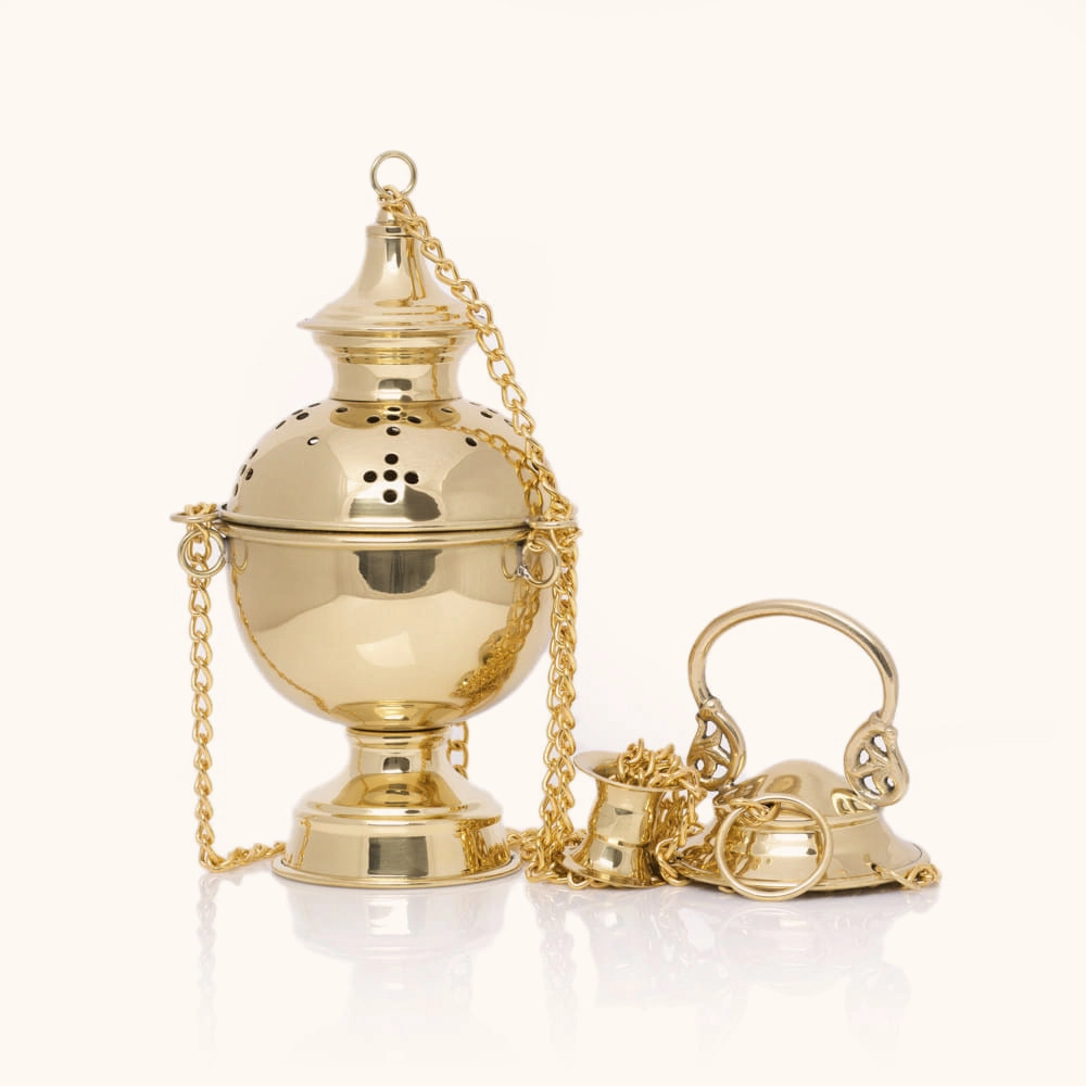Trybularz wykonany z mosiądzu o wysokości 23 cm. Posiada klasyczny kształt z otworami wentylacyjnymi i pokrywą na łańcuszku. Prosty, solidny i funkcjonalny – doskonały do codziennego użytku liturgicznego w kościołach i kaplicach.