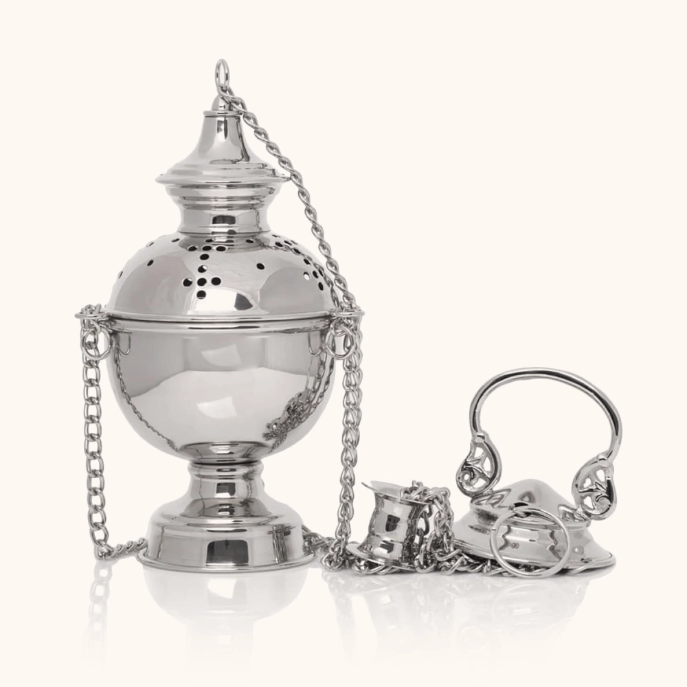 Trybularz wykonany z mosiądzu, ozdobiony niklowanymi elementami. Wysokość: 24 cm. Klasyczna forma z otworami wentylacyjnymi i solidnym łańcuszkiem. Trwały, estetyczny i wygodny w użytkowaniu – przeznaczony do liturgii i nabożeństw.