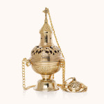 Trybularz z mosiądzu o wysokości 26 cm. Posiada dekoracyjną pokrywę z krzyżem oraz solidny łańcuszek. Starannie wykonany, trwały i wygodny w użytkowaniu. Przeznaczony do liturgii i nabożeństw – łączy funkcjonalność z eleganckim wyglądem.